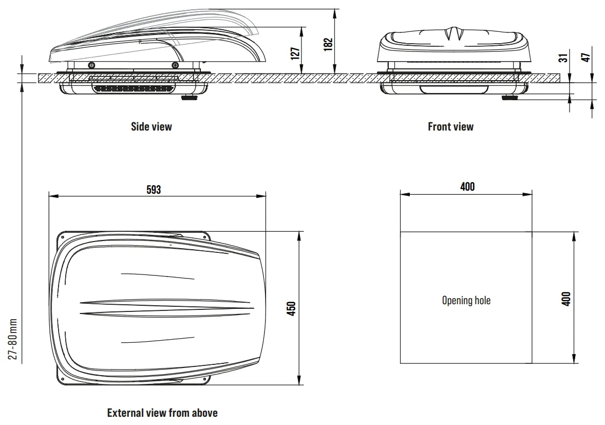 It fits the standard 400 x 400 mm cut-out, common on many UK caravans and motorhomes. Roof thickness should be between 27-80 mm on a flat surface. Installation is straightforward with just sealant and screws — simply check your existing rooflight matches before ordering.