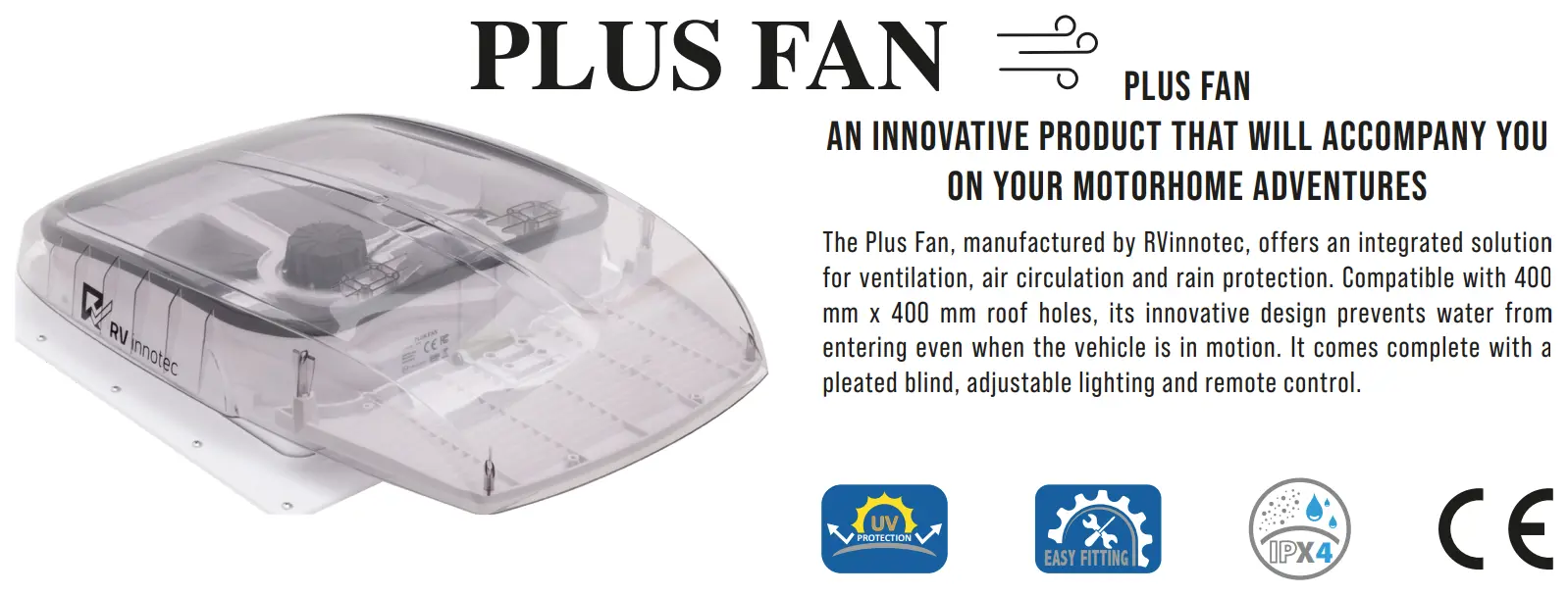 Yes, the RVinnotec Plus Fan is designed for tough conditions. Its clever dome design and reliable seals keep water out even while you’re on the move. With an IPX4 rating, it handles water spray from any direction, and you can safely run the fan with the lid closed during storms or motorway journeys.