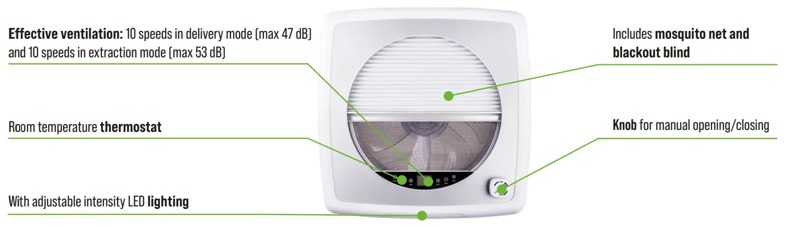 With 10 fan speeds in both delivery and extraction modes, and maximum noise levels of around 47 dB on intake and 53 dB on extract, it is a practical option if you sleep close to the vent or stay on quieter sites. The 12 V DC motor draws up to 20 W plus around 4 W for the integrated LED lighting, with a peak current of roughly 1.6 A at speed 10, making it a good match for leisure batteries and solar-powered, off-grid setups.
