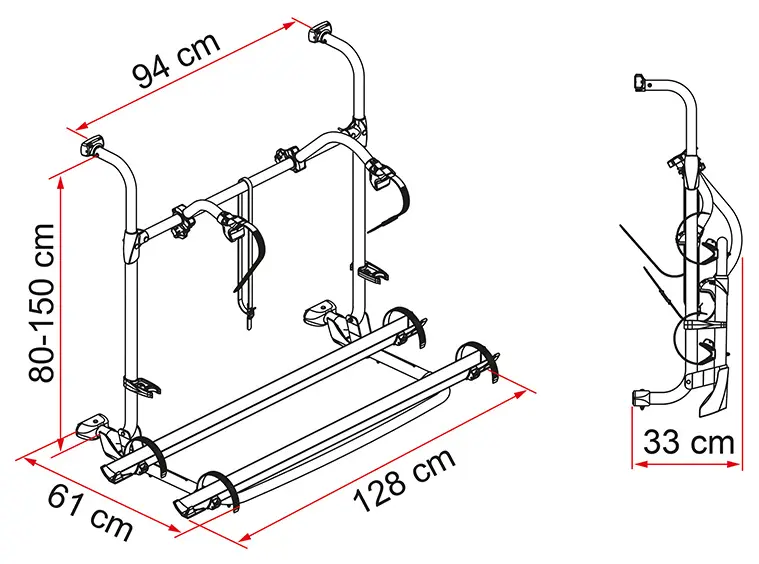 The Rail Quick Pro system allows you to secure bike wheels quickly with reinforced straps, while the included Bike-Block Pro S 2 and Pro S 3 frame clamps hold your bikes firmly during transit. The rack features a 30cm distance between rails, providing adequate spacing to prevent bikes from touching during travel. With dimensions of 128 x 61 x 80cm, the carrier remains compact when not in use, and the lightweight aluminium construction means it adds minimal weight to your motorhome's rear axle load.