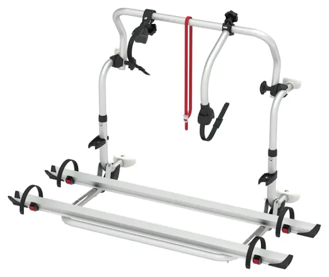 This carrier uses Fiamma's Bike-Block Pro S system, supplied with both Pro S 1 and Pro S 3 blocks to secure your bikes firmly in place. The sliding wheel supports adjust to different tyre widths, whilst integrated straps add extra stability during travel. With dimensions of 128 x 61.5 x 40cm when installed, the compact height means it typically fits below rear windows on Laika motorhomes, leaving your view and window operation unaffected. The design allows you to access your bikes easily whilst keeping them protected during transit between destinations.