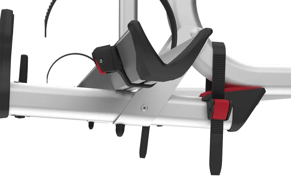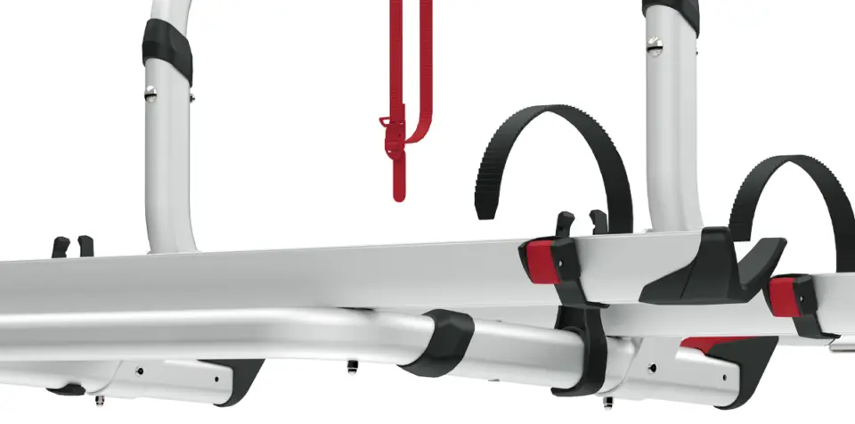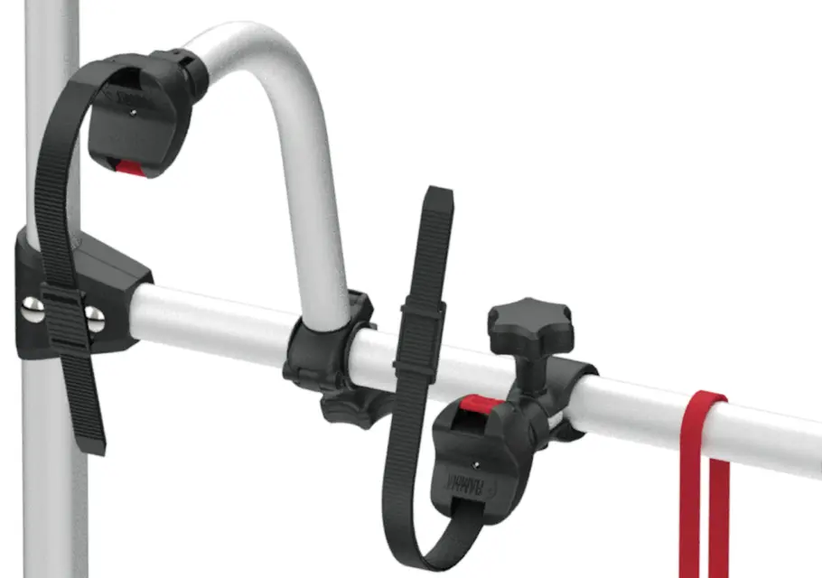 The rounded tube construction provides stability during travel whilst the bottom support bar fixing system adds security at the base mounting point. The Rail Plus system uses a track design where bike wheels sit securely, held in place by the Bike-Block systems that clamp around the frame. Each rail handles bikes with different wheelbases, and the 15cm separation prevents handlebar interference. The carrier works on caravans too, though you'll want to check compatibility with customer service first since mounting requirements differ from motorhome installations.