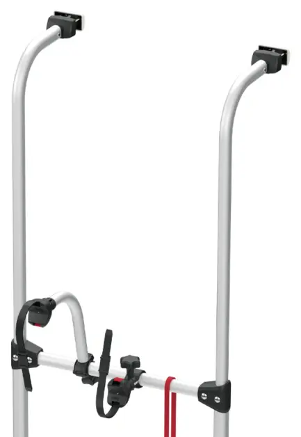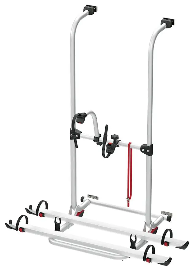 The Pro N uses a telescopic rounded tube structure that adjusts vertically from 80-150cm, allowing installation on different motorhome configurations. It's designed for vehicles with existing Fiamma brackets already fitted to the rear wall, which is why it comes without separate mounting hardware. The adjustable design means it accommodates both standard bikes (up to four with additional parts) and e-bikes (two maximum), with 15cm spacing between rails for secure wheel positioning.