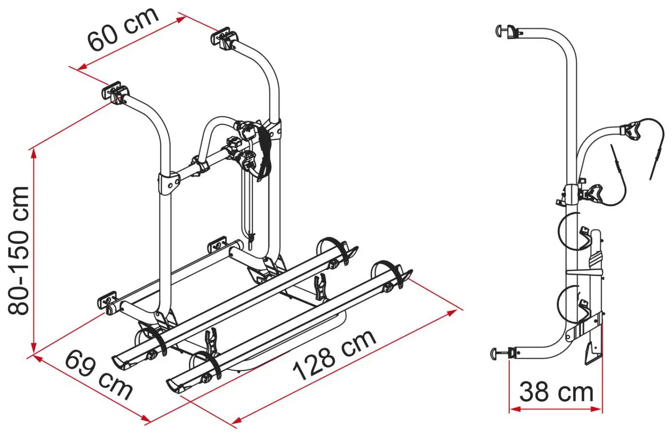 The Fiamma Pro N has a telescopic structure with vertical wheelbase adjustment from 80cm to 150cm. This 70cm adjustment range allows the carrier to fit different motorhome rear wall configurations and heights. The frame itself adjusts from 40-80cm in height, whilst the horizontal wheelbase (distance between mounting brackets) is fixed at 60cm. The rounded aluminium tube design makes height adjustment straightforward, and the adjustable upper structure provides better stability once set to your required height.