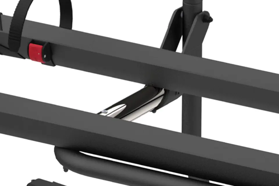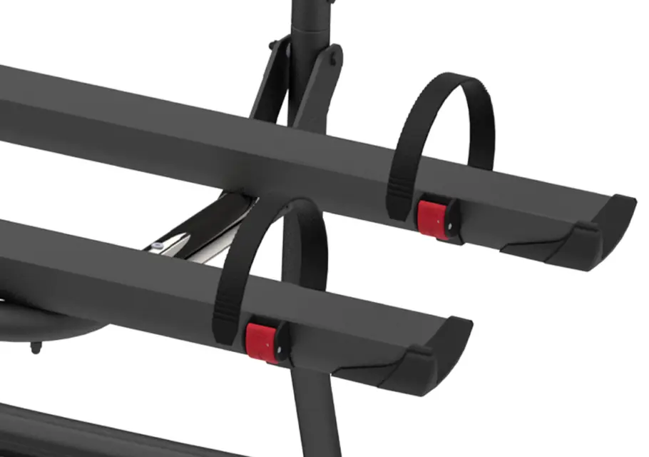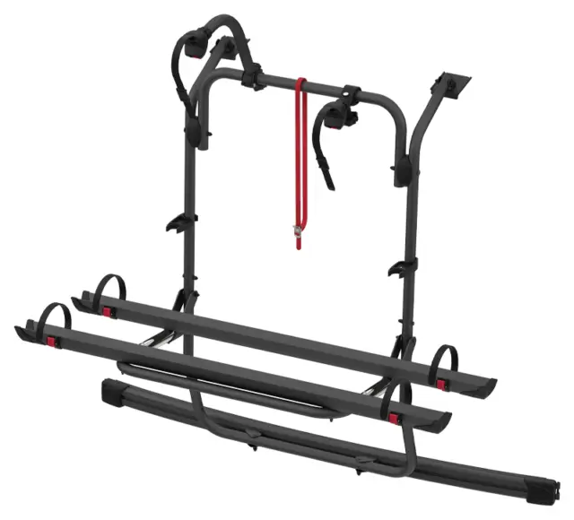 The carrier measures 145.8 x 62.5 x 114cm when assembled and allows you to open the tailgate with the rack mounted, provided no bikes are fitted. The Rail Plus system accommodates various bike frame sizes and styles, whilst the Bike-Block Pro locking systems keep bikes stable during travel. A licence plate carrier with control lighting is available separately as an optional extra, which you'll need to display your registration plate when bikes obscure the vehicle's original plate. The contoured profile design means the rack sits flush against your campervan's tailgate, distributing weight evenly across reinforced mounting points.
