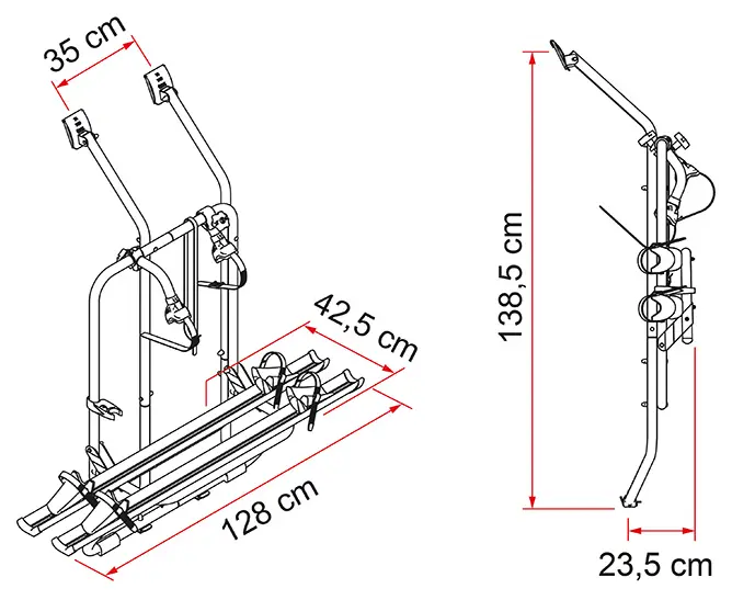 The Fiamma Carry-Bike V T4 D has a maximum load capacity of 35kg across both bikes. This is lower than the single door T4 model (which carries 60kg) because the double door configuration requires a different weight distribution. The carrier itself weighs 7.9kg and is rated for two standard bikes only, not e-bikes. The 15cm spacing between Rail Plus rails accommodates typical adult bike frame widths.