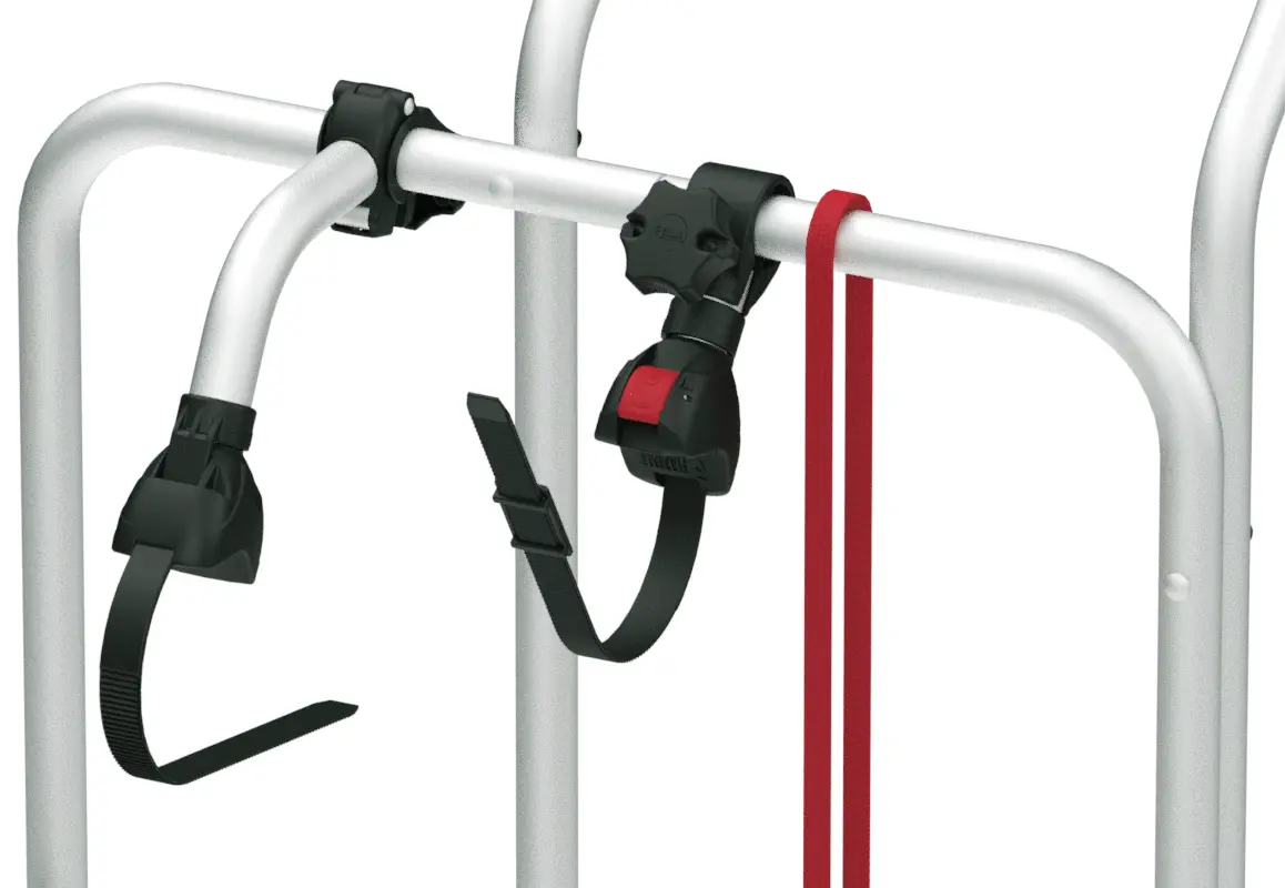 The carrier comes with Bike-Block Pro S 1 and Pro S 2 locking systems that secure your bike frames to the rails. These feature rotating end blocks that grip frames of different shapes and diameters. The package also includes two Rail Plus bike rails, a 2-metre Security Strip for additional theft protection, and rack holders to secure the rails when folded. The Pro S bike blocks are specifically designed for the Rail Plus system included with this model.