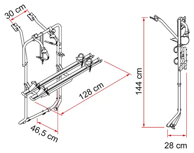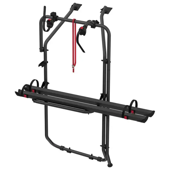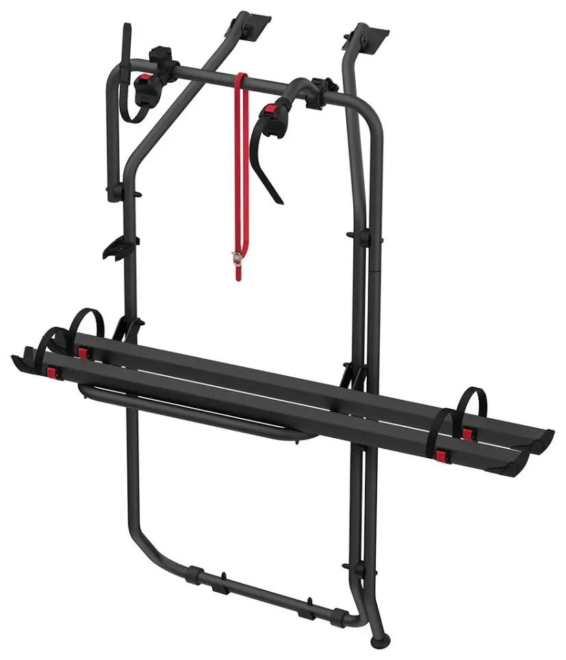 The Fiamma Carry-Bike VW T5 D / T6 D provides a dedicated bike transport solution for VW Transporter, Caravelle, and Multivan models with twin rear doors. This drill-free installation system attaches directly to your vehicle using specially designed brackets that secure to the double door configuration found on T5 models from 2003 to 2014, T6 models from 2014 onwards, and T6.1 variants. Weighing 7.1kg, the carrier itself adds minimal extra weight while offering a 35kg maximum load capacity across its dual Rail Plus system, accommodating two standard bikes.