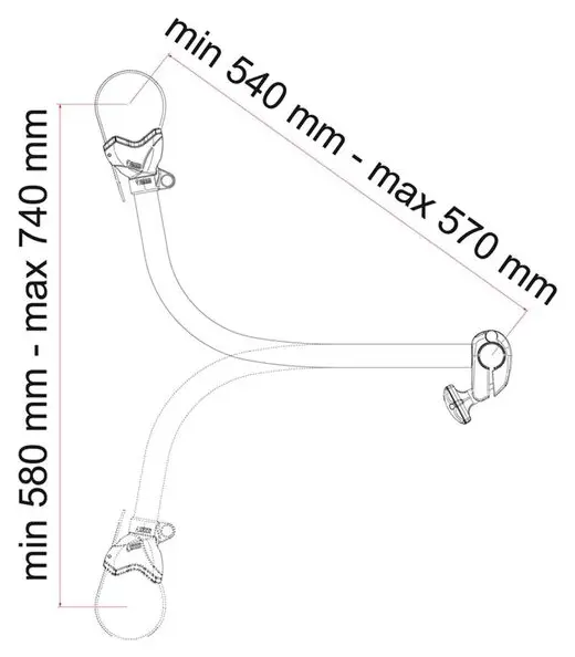 The Bike-Block Pro S 4 has an adjustable arm that spans from 54cm to 57cm. This measurement refers to the distance from the rack upright connection point to the bicycle frame clamp. The arm length is longer than the Pro S 1, S 2, and S 3 versions because it needs to reach across three already-mounted bikes to hold the outermost fourth bike in position.