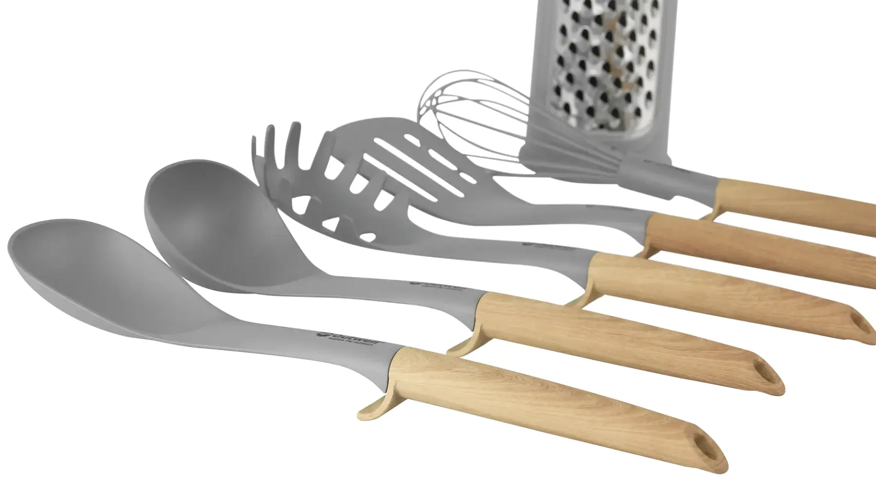 At 560g total and packing down to 34cm tall, this set fits easily into most camping kitchen storage boxes or awning cupboards. The silicone heads on the utensils handle heat well and clean up quickly under a tap, which matters when you're working with limited water. The whisk works properly for scrambled eggs or batter, the pasta spoon has proper drainage holes, and the ladle holds a decent portion. The grater stays stable when you're using it because the base sits flat, though you'll want to be careful with the stainless steel blades when packing and unpacking.