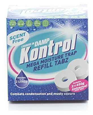 Both scented and scent-free Kontrol tabs contain the same 450g of compressed calcium chloride desiccant and absorb identical amounts of moisture. Scented variants release a subtle fragrance as they work, which can help mask musty odours whilst the tab tackles underlying dampness. Scent-free tabs provide pure moisture absorption without added fragrance, making them preferable for anyone sensitive to scents or for use in food storage areas. The dehumidifying performance and coverage area remain consistent across both options, so choice comes down to personal preference regarding fragrance.
