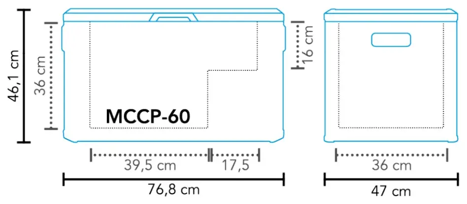 The MCCP-60 measures 76.8cm length by 47cm width by 46.1cm height with a weight of 23.4kg empty. Most panel van conversions and larger motorhome garages accommodate these dimensions, but measure your available space before purchasing. The twin-side access design means you can position it with either side facing outward depending on your layout. In caravan front lockers, check both the opening dimensions and internal height as this cooler stands taller than many traditional cool boxes. The weight requires two people for safe lifting when loaded.