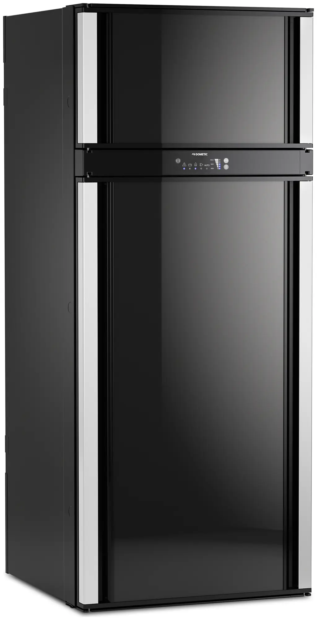 Both the main fridge door and separate freezer door feature Dometic's patented double-hinge system, allowing each to open left or right without any hinge conversion work. Full-height aluminium handles are fitted on both sides of each door, so you can pull either door open from whichever direction suits your kitchen layout. This is particularly useful in tight spaces or when your motorhome layout means approaching the fridge from different angles.