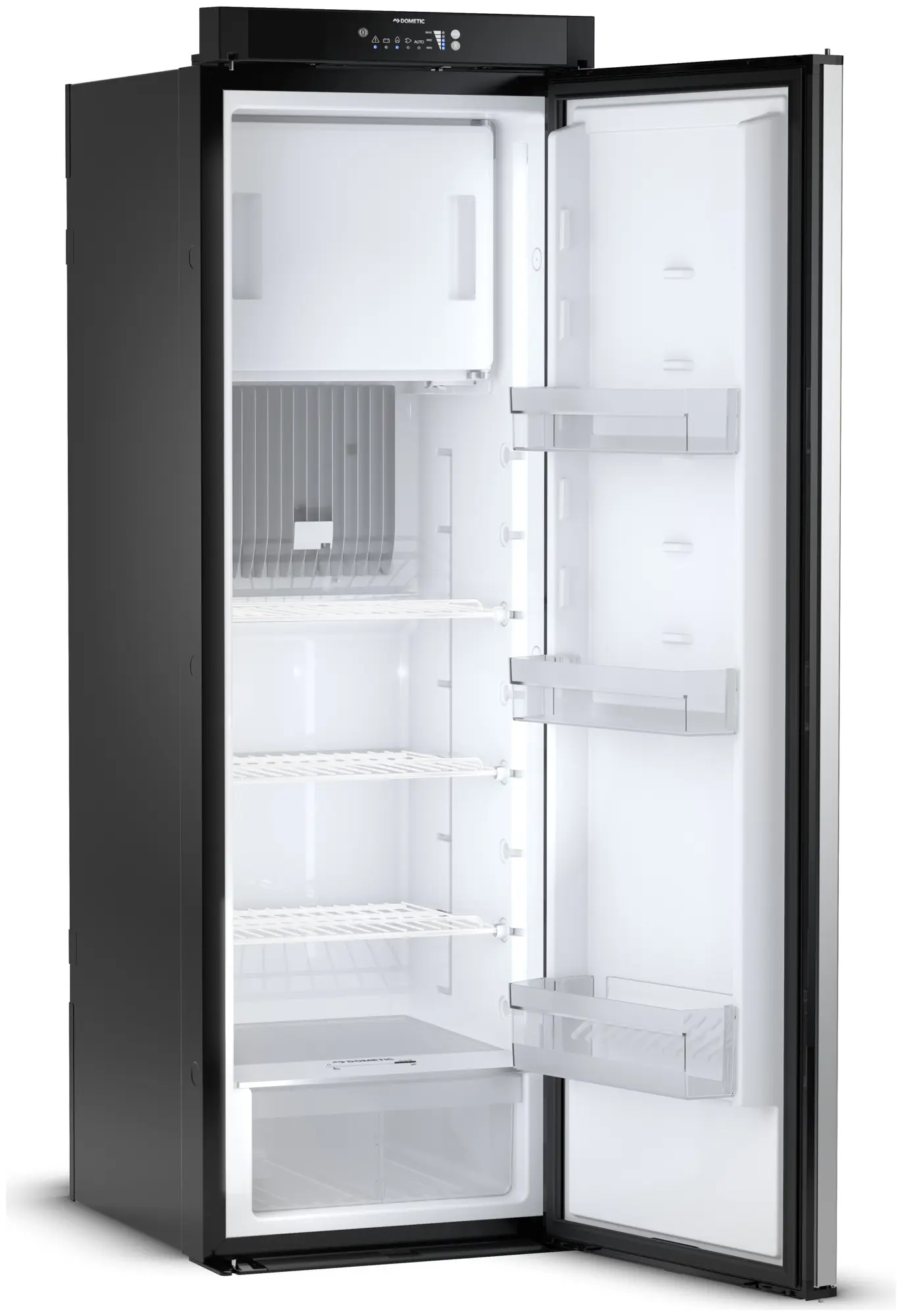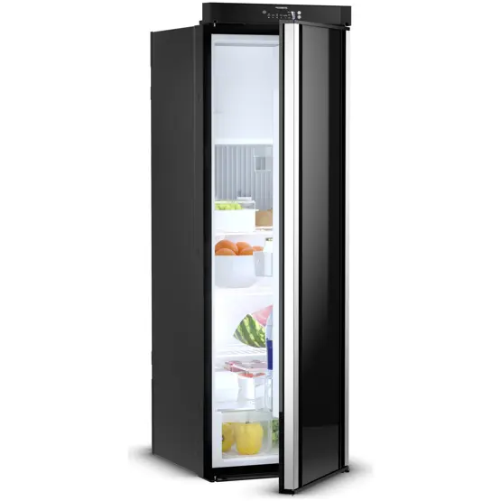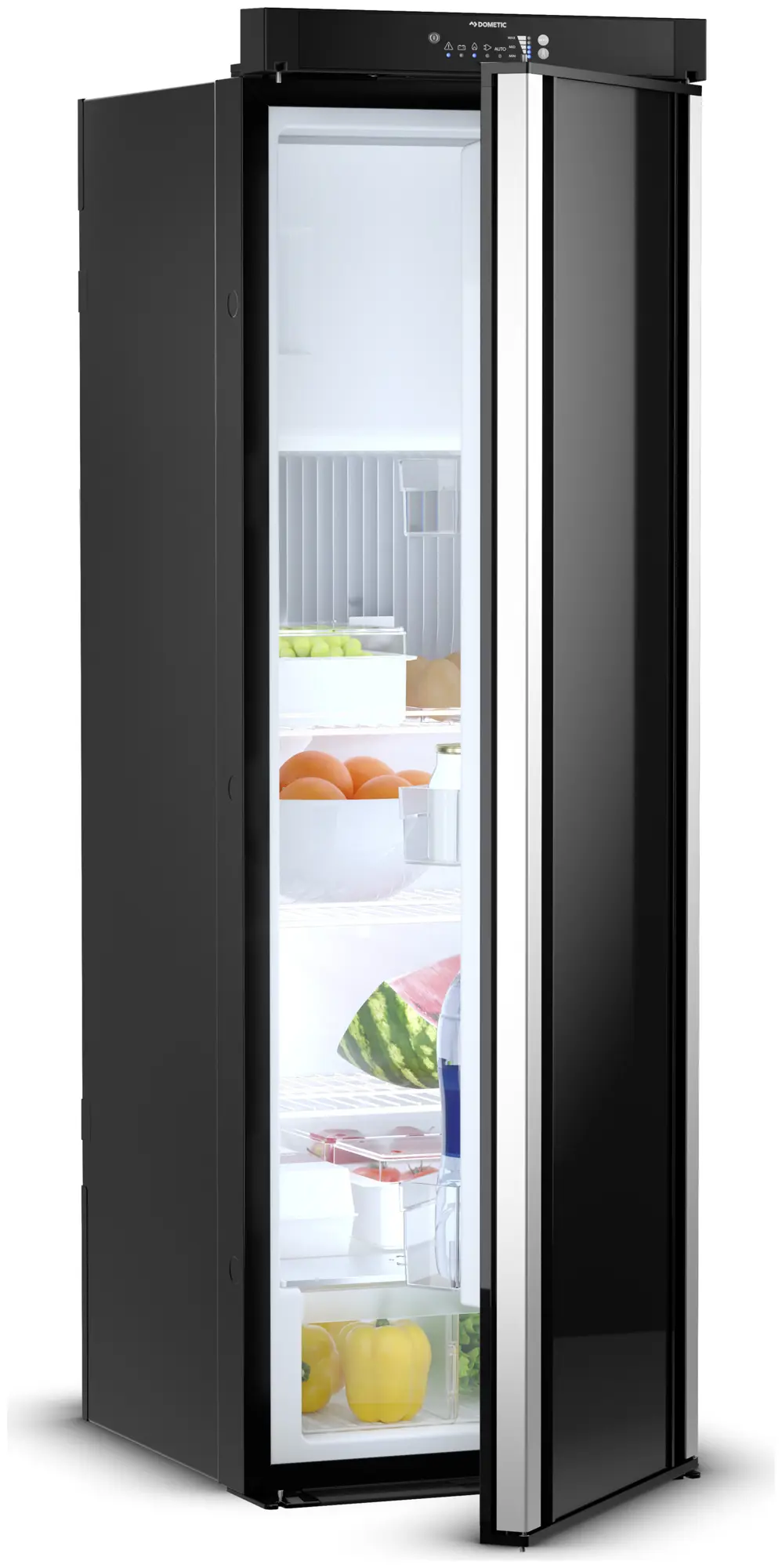 The Dometic RML 10.4P slim tower absorption fridge provides 133 litres of storage in a tall, slender design that fits neatly into compact kitchen spaces in caravans and motorhomes. Running on 12V, 230V or LPG gas with automatic energy selection, it switches between power sources to keep your provisions chilled wherever you're pitched. The double-hinged door opens left or right using full-height aluminium handles, whilst the removable freezer compartment also features double hinges for convenient access. The VG-Fresh crisper lid controls humidity to keep fruit and vegetables fresh for longer, and doubles as an extra storage shelf when you need it.