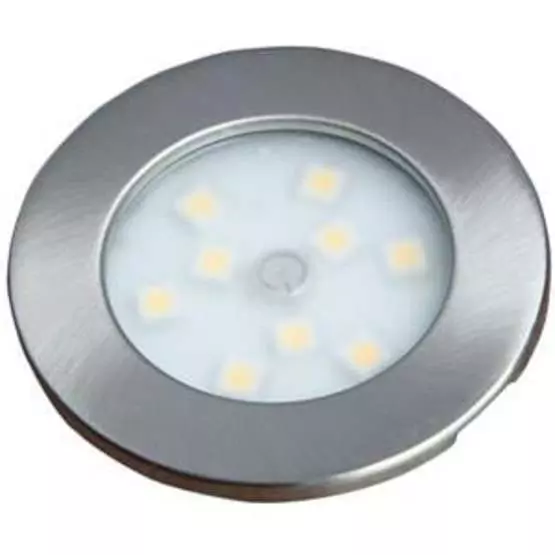 A slim recessed down light with a brushed nickel finish. This down light is switched on or off by merely touching the illuminated button in the centre of the lens. Keeping contact with the button will cause the unit to dim down and then back up again.