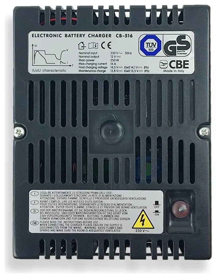 The CB516 switch mode charger charges lead-acid, AGM, and gel leisure batteries using a three-stage charging algorithm that maximises battery lifespan. The 16-amp output suits most single or dual leisure battery setups common in UK motorhomes and campervans. Lithium batteries require different charging profiles, so the standard CB516 is not compatible with lithium battery banks. CBE manufactures separate charger models specifically for lithium batteries if your system uses that technology. The charger automatically adjusts charging current based on battery condition and ambient temperature readings.