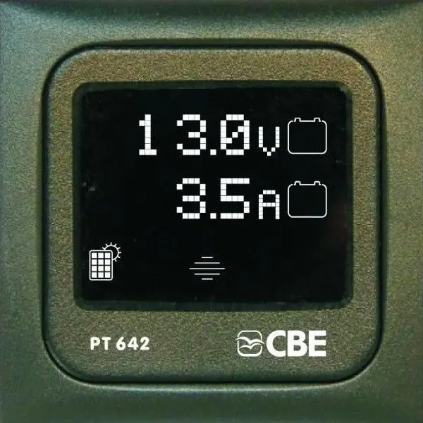 The PT642 displays two key measurements: your leisure battery voltage in volts (V) and the current being supplied by your solar panels in amps (A). This real-time data helps you monitor whether your photovoltaic modules are generating power and how much charge is flowing into your battery. The digital readout provides numerical values rather than vague LED indicators, giving you precise information about your solar charging system performance.