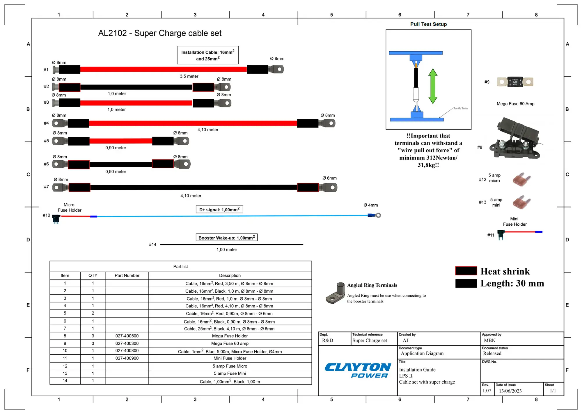The Clayton Power 5m Cable Set provides everything you need to wire your LPS II power supply for alternator charging and to install the 600W Super Charge DC-DC Converter between your vehicle battery and leisure battery system. This complete kit includes 16mm² power cables with pre-fitted 8mm ring terminals, three 60A mega fuses with holders, a 5-metre D+ ignition signal wire with fuse holder, and a 25mm² black ground cable - all the heavy-duty wiring required for a professional installation. The cables connect to the DC IN and C1 terminals at the back of your LPS II unit, with the 16mm² sizing meeting Clayton Power's specification for runs up to 5 metres without excessive voltage drop at 40A+ charge currents.