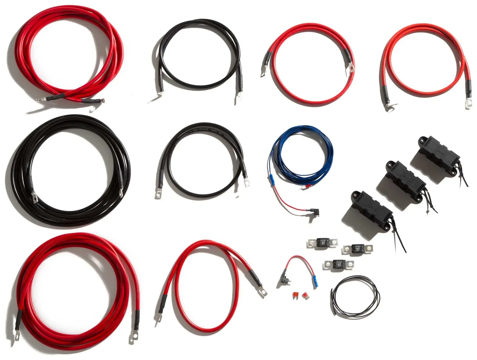 One thing that sets this apart from the standard alternator cable kit (AL2101) is the inclusion of extra cables specifically for routing through the Super Charge DC-DC converter, which sits between your vehicle's alternator circuit and the LPS II's DC output terminals. You're getting longer runs of 16mm² cable (including a 3.5m red positive and 4.1m lengths for both positive and negative), plus the beefier 25mm² ground cable that handles the bidirectional current flow when using jump-start mode. The kit arrives with all fuses, holders and terminals fitted, so you're not hunting for M6 or M8 crimps separately. Just remember you'll still need proper cable routing clips and possibly additional earth bonding straps depending on your vehicle's chassis configuration and where you're mounting the LPS II unit.