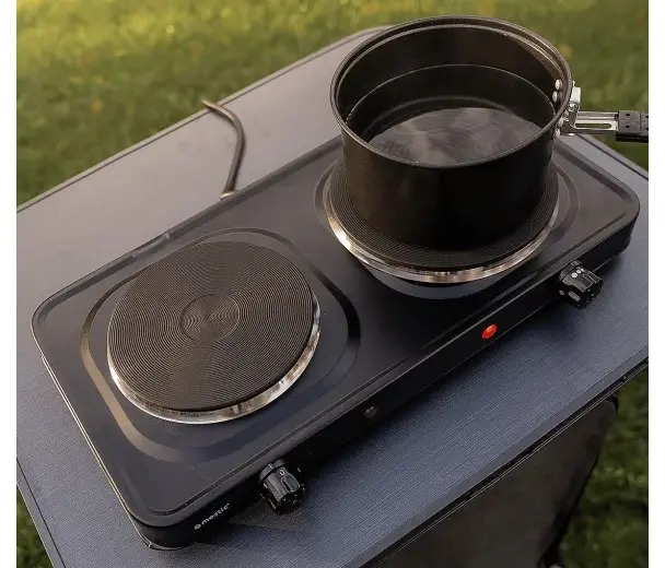 The maximum combined power draw is 2500W (2.5kW) when both burners run simultaneously at full power (1000W plus 1500W). Most UK campsites provide 10A or 16A hookups, which deliver 2300W or 3680W respectively at 230V. On a 10A supply, running both burners at maximum alongside other appliances may trip your circuit breaker, so manage your electrical load accordingly.