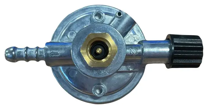 Once connected, the ribbed nozzle accepts a rubber gas hose so you can run the supply directly to a camping stove or small gas appliance. It's a solid pick for festival camping, touring, or any setup where saving weight and space matters. The sealed on/off dial gives you controlled gas flow and a safe way to shut down between uses.