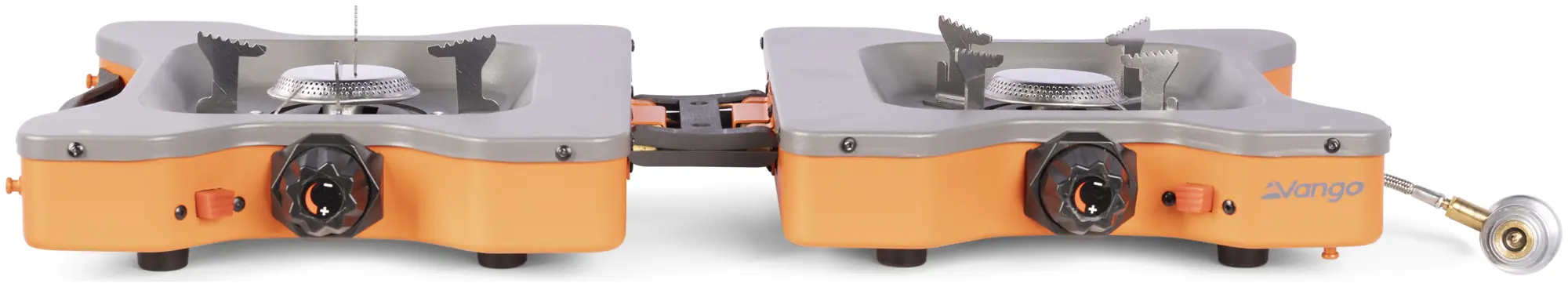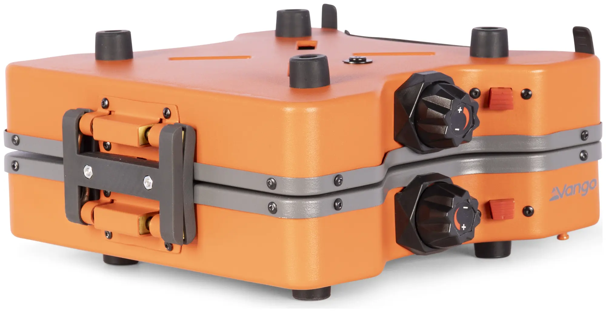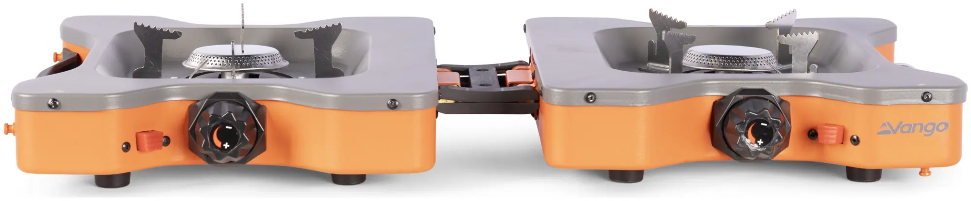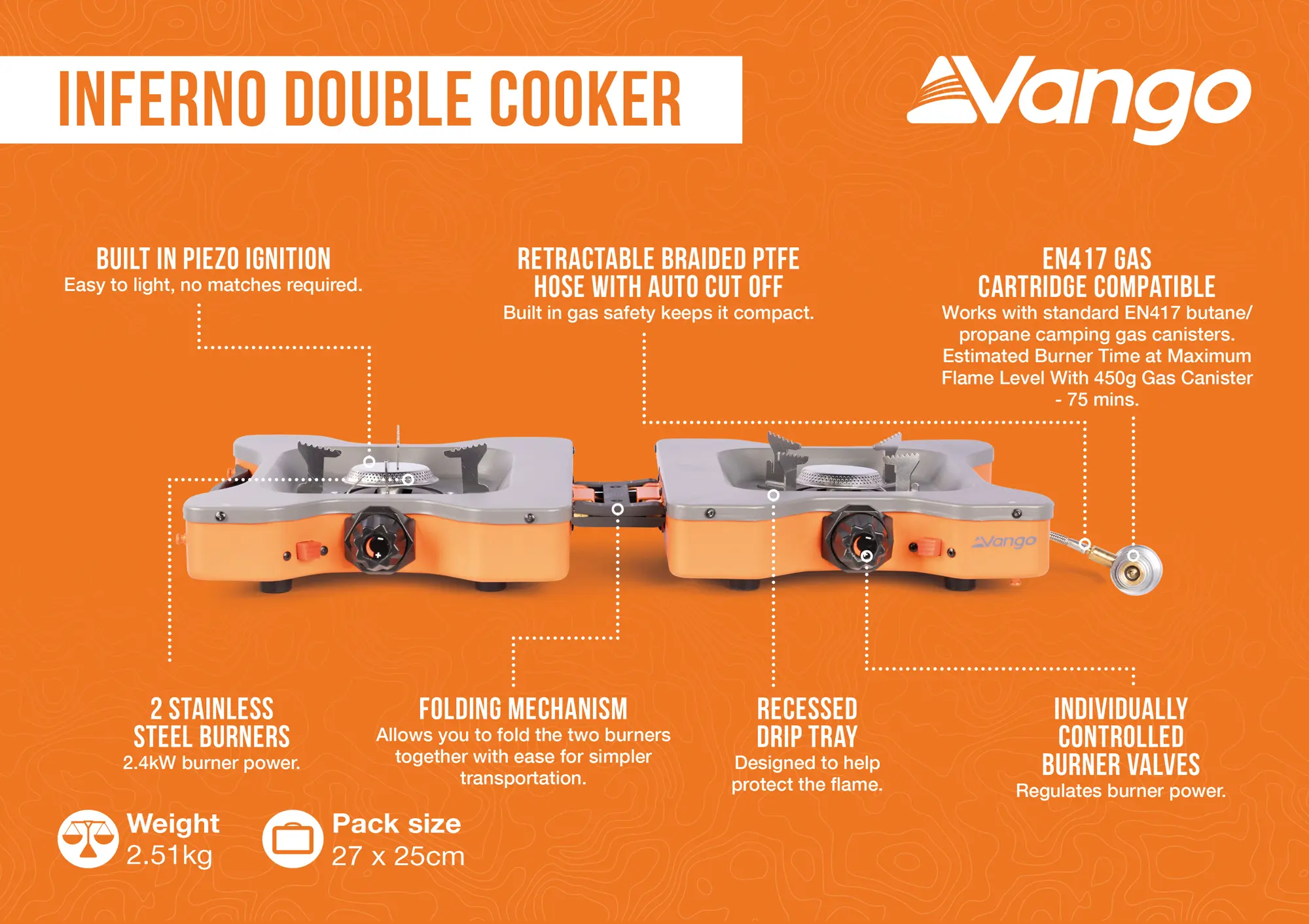 The Vango Inferno Double Cooker delivers 4.8kW of total cooking power across two independently controlled 2.4kW stainless steel burners. This twin-burner camping stove uses EN417 threaded gas canisters (the standard screw-on type found in most camping shops) and folds flat for transport, making it practical for car camping, caravan awnings, or any outdoor cooking setup where you need two full-size burners. Built-in piezo ignition means you can light both burners without matches, and each burner has its own valve so you can simmer on one while boiling on the other. A 450g gas canister runs each burner at full flame for roughly 75 minutes, though you'll get longer from lower heat settings.