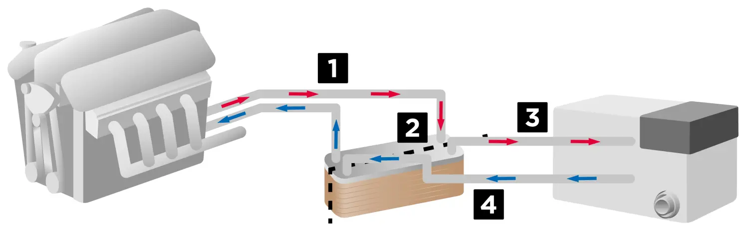 2. In the heat exchanger, the heat from the engine coolant is transferred to the glycol fluid of the heating system.