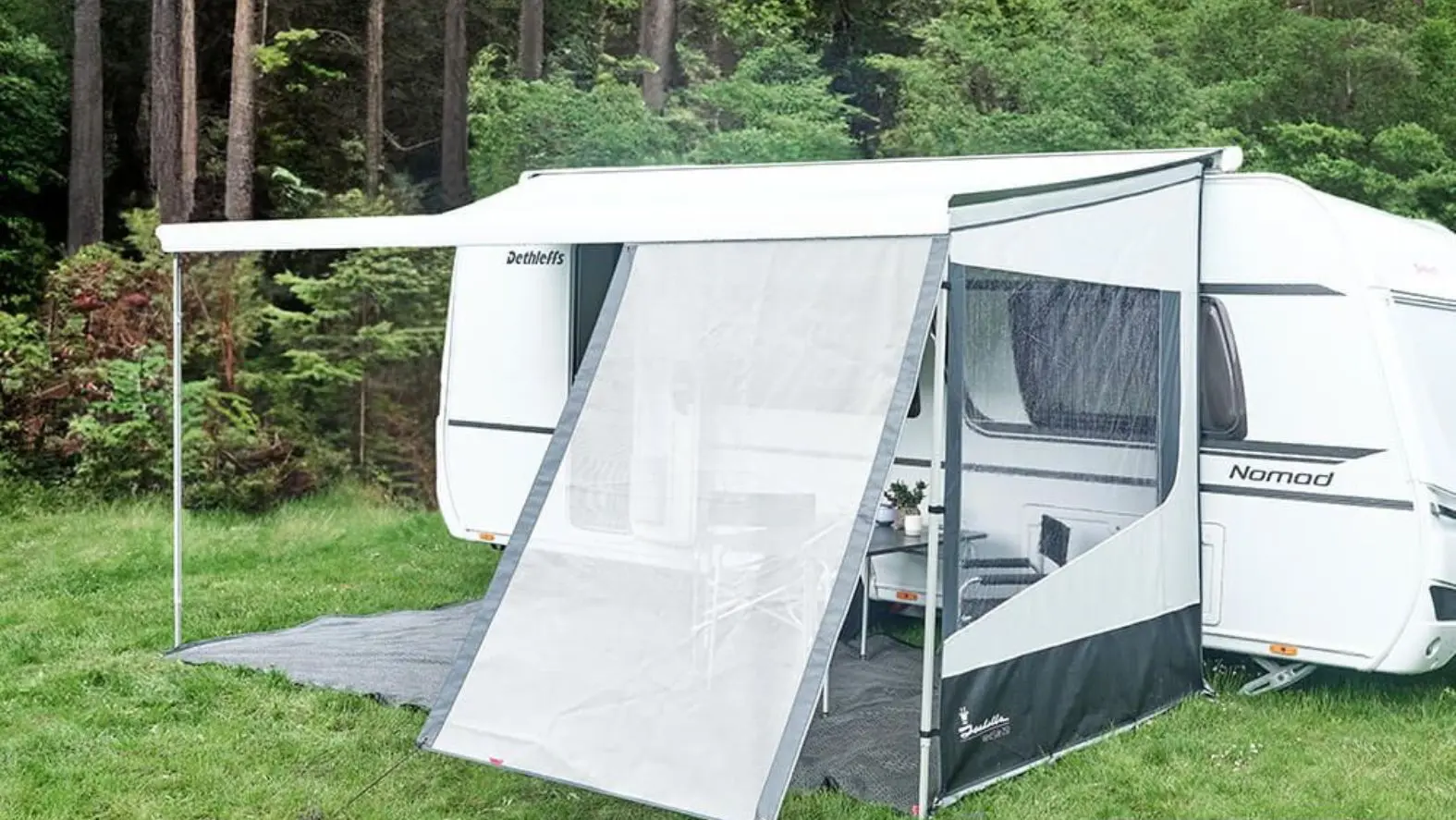 Breathable mesh shade for caravan wind out awnings. Fits Thule/Dometic.