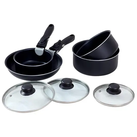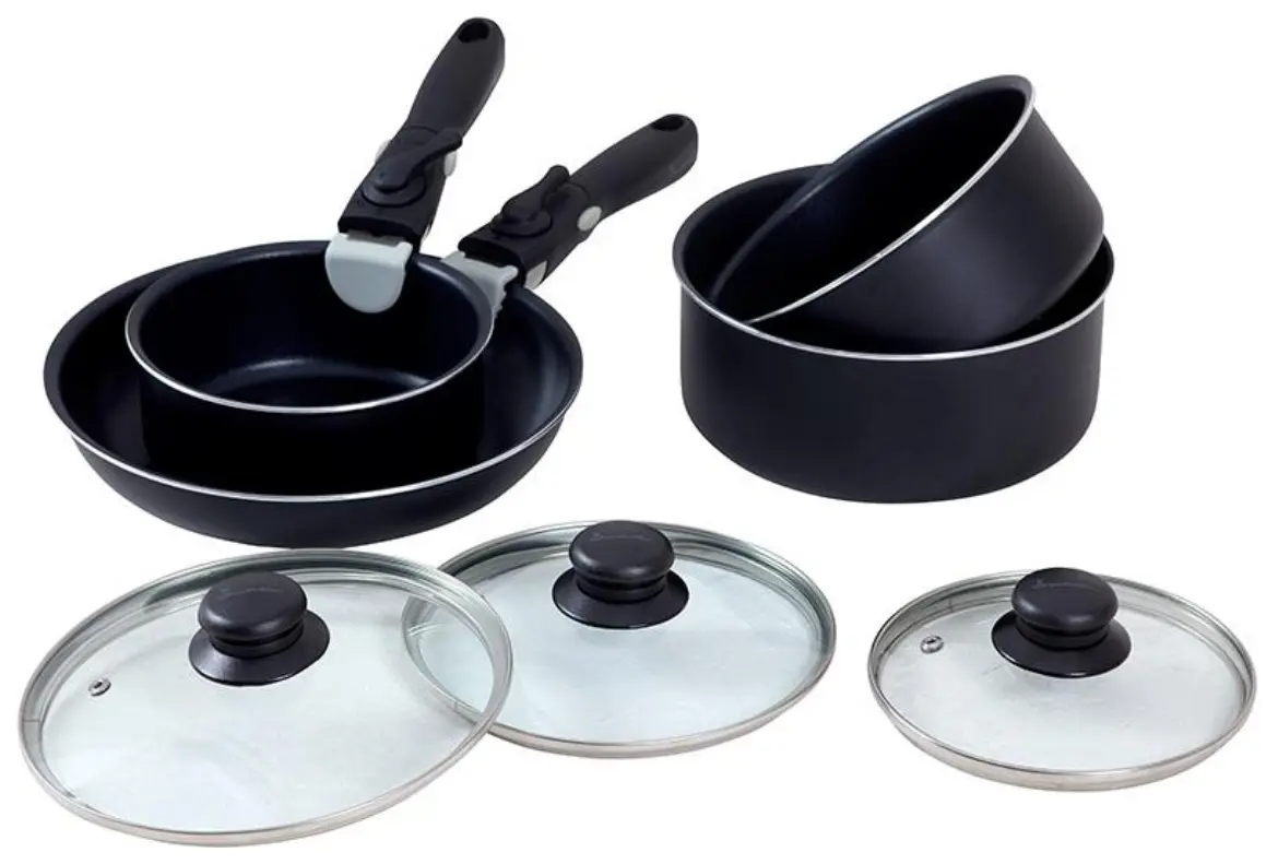 So you have lots of ways to create delicious outdoor dining experiences. The set comes with a single removable handle, so the pots and pans can be stacked to take up minimal space. The pot and pan set consists of 3 pots, 1 frying pan, 3 lids and 2 removable handles.