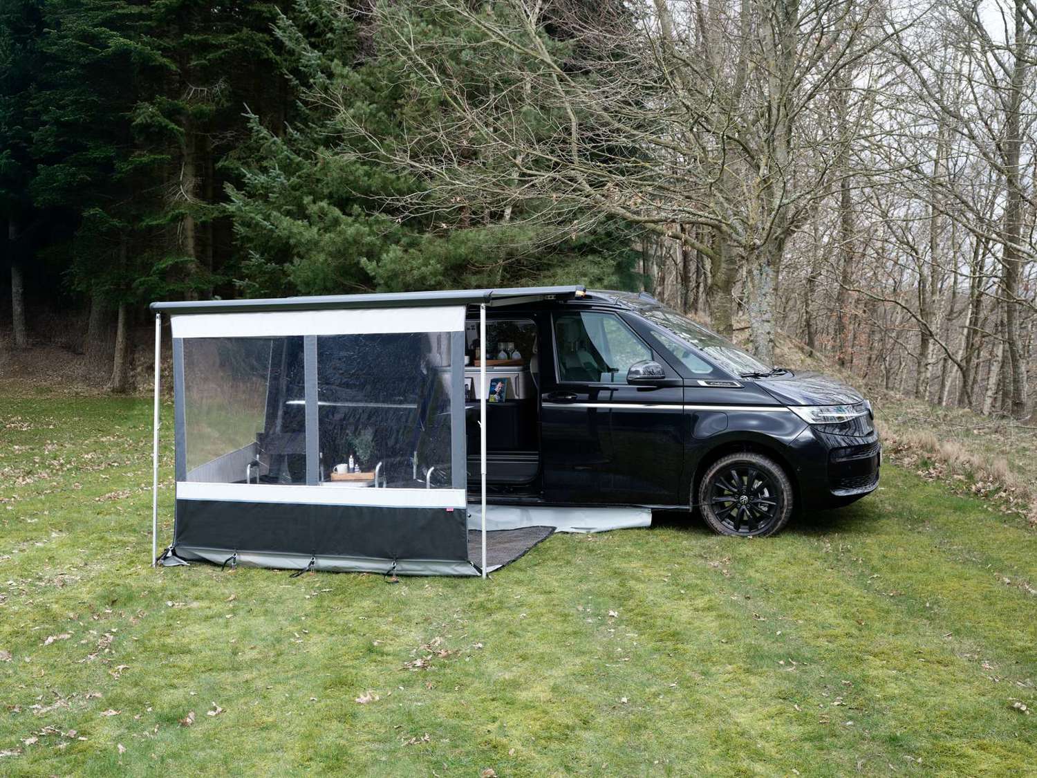 The Isabella Van Front, Sides and Curtains system transforms your campervan's wind-out canopy into a fully enclosed outdoor living space. This modular setup includes the Van Front panel, two Van Side panels (available separately for left or right mounting), and a four-piece curtain set that works across all components. Each piece attaches to wind-out canopies measuring 200cm deep and at least 260cm wide, fitting popular models like the VW California, Mercedes Marco Polo, Ford Nugget and Renault Space Nomad. The Van Side panels use three suction cups for a draught-proof seal against your van, while the Van Front completes the enclosure underneath your canopy.