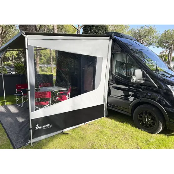 Isabella Wind Side 250 - Left or Right wind-out canopy side panel creates sheltered outdoor space for caravans and motorhomes. 240cm deep, 4-minute setup, CarbonX pole and clear PVC window. UV resistant IsaLight fabric with suction cup attachment system.