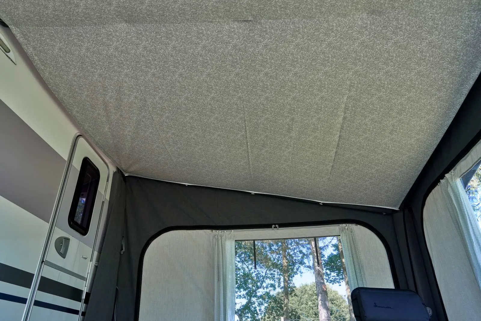 The optional inner roof creates an insulating air gap between itself and the main awning roof, significantly reducing condensation when temperatures drop overnight. This matters most during spring and autumn when warm air inside meets cold roof fabric, causing water droplets to form and drip. The inner roof also provides a more finished appearance inside and slightly improves heat retention. Installation uses the pre-fitted rings already sewn into the awning structure, so fitting takes minutes without modifications.