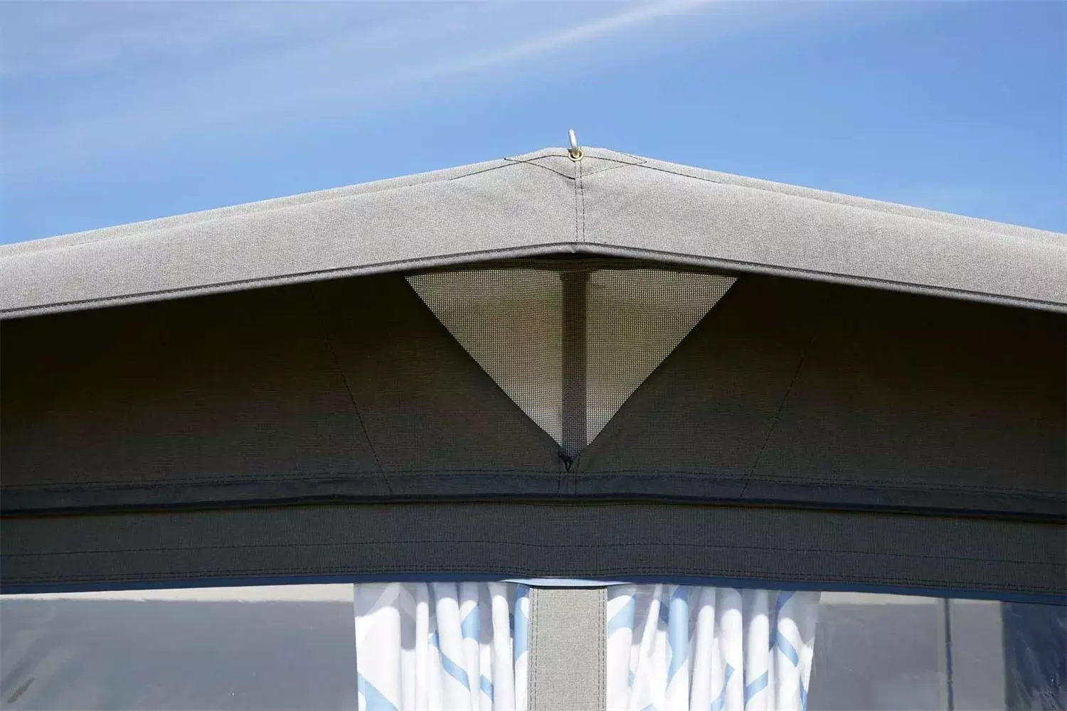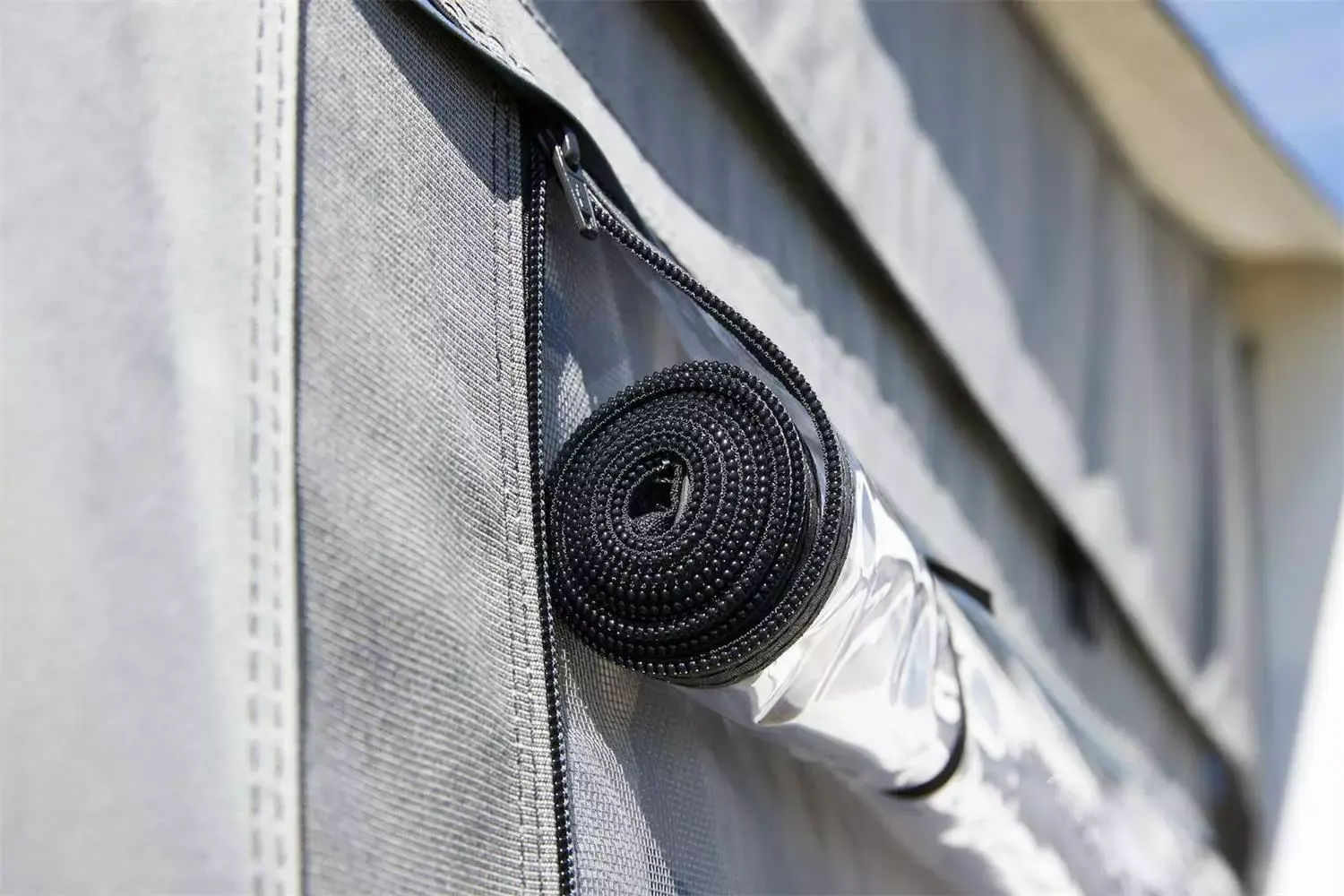 In all Isabella awnings, a durable, acrylic-coated polyester product has been used for the roof, which is top-lacquered to reduce the accumulation of dirt. The roof canvas is fully impregnated and stitched with double-folded seams to guarantee it will withstand even heavy rainfall. The inside is patterned to create a pleasant indoor environment, but this also helps make any impurities on the outside less noticeable.