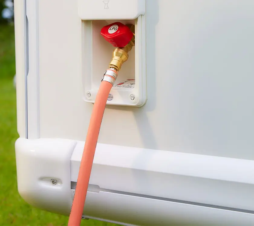 The 5 metre hose length provides extended reach for motorhomes and caravans where the gas locker sits at a distance from the cooking area. This length suits rear gas lockers serving front cooking positions or awning setups where your BBQ sits away from the vehicle. Measure the straight-line distance from your cylinder storage compartment to where your BBQ or cooker will sit, accounting for any routing around corners or obstacles. The extended length offers flexibility for varied pitch layouts.