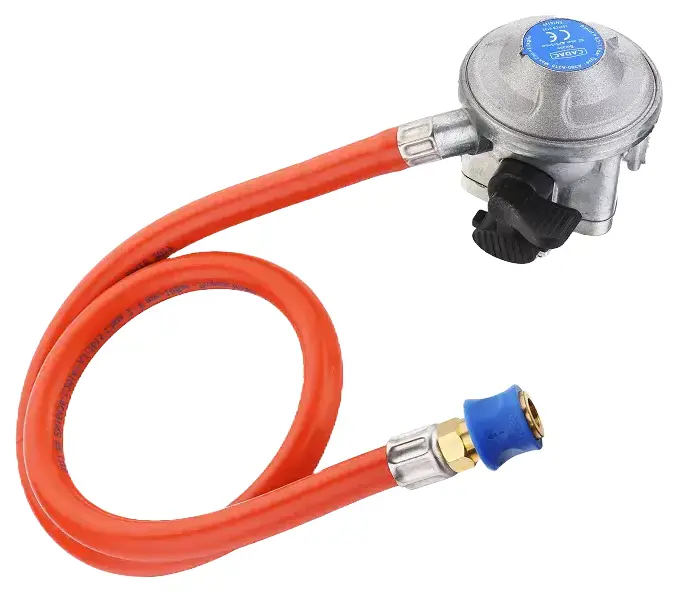The hose is factory-crimped onto the regulator body for safety compliance, so you can't replace just the hose section. If the hose gets damaged, you need to replace the complete regulator assembly. This design eliminates connection failures that can happen with separate hoses and jubilee clips.