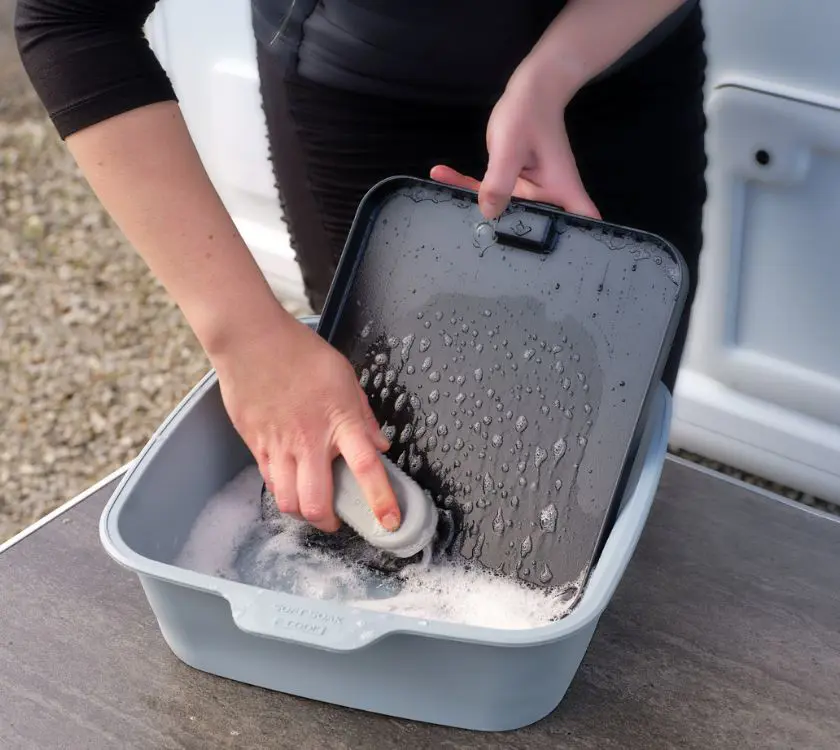 The Cadac Soft Soak 2 Cook is a flexible silicone soaking tray designed specifically for cleaning grill plates from the Cadac 2 Cook 2 and 2 Cook 3 ranges. This food-grade silicone basin holds both grill plates simultaneously, letting you soak away burnt-on residue while you relax after cooking. The tray measures 39 x 34 x 10cm and withstands temperatures up to 220°C, so you can add hot soapy water straight from the kettle.