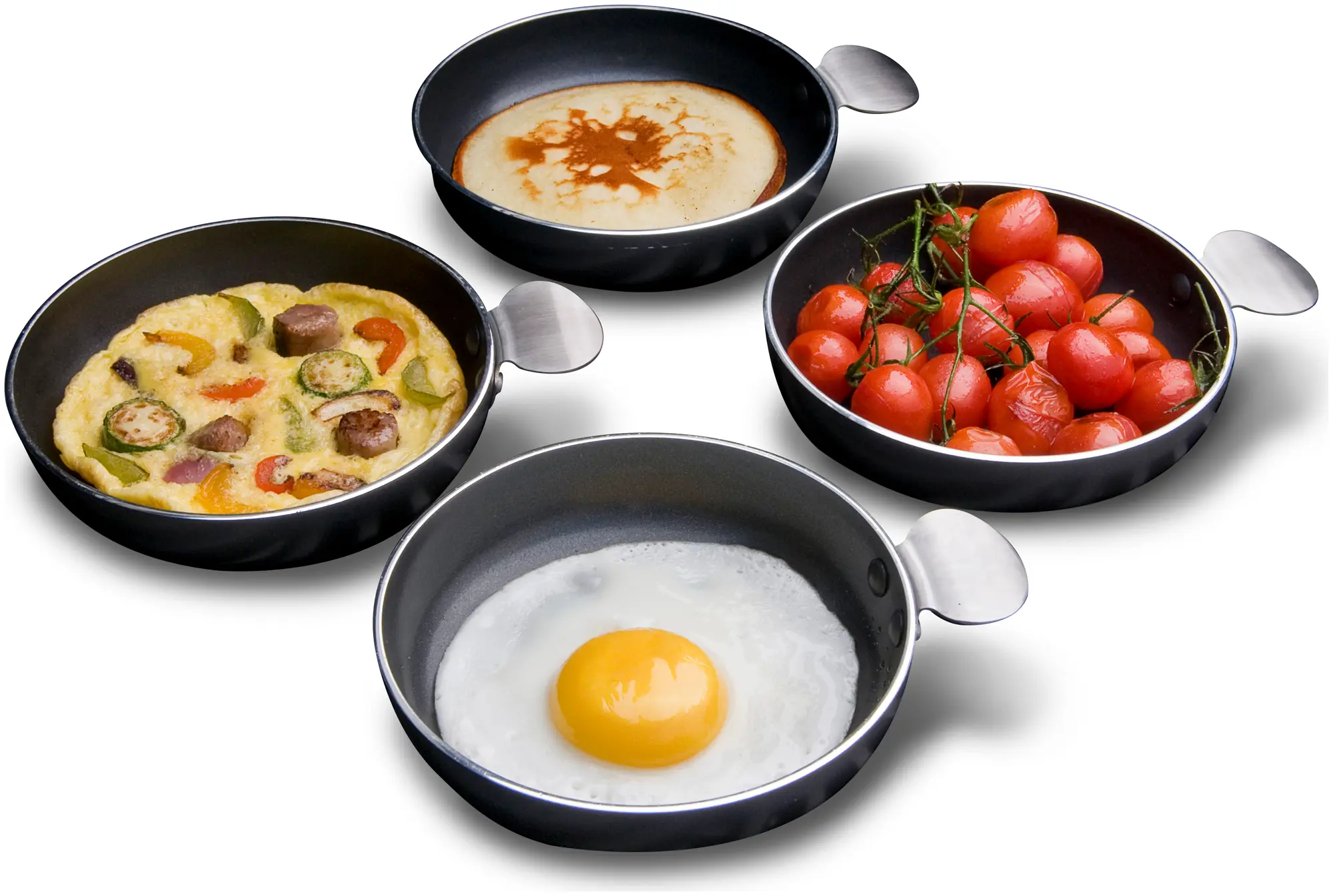 Each 12.5cm pan handles single-serving portions. For eggs, you can cook one or two eggs per pan depending on preparation method. For tapas dishes, the pans suit small portions of prawns, chorizo, vegetables or cheese dishes typical of Spanish tapas service. The four-pan set allows you to prepare different dishes simultaneously or cook eggs to individual preferences when camping with family or friends. These pans are not designed for family-sized portions in a single pan.