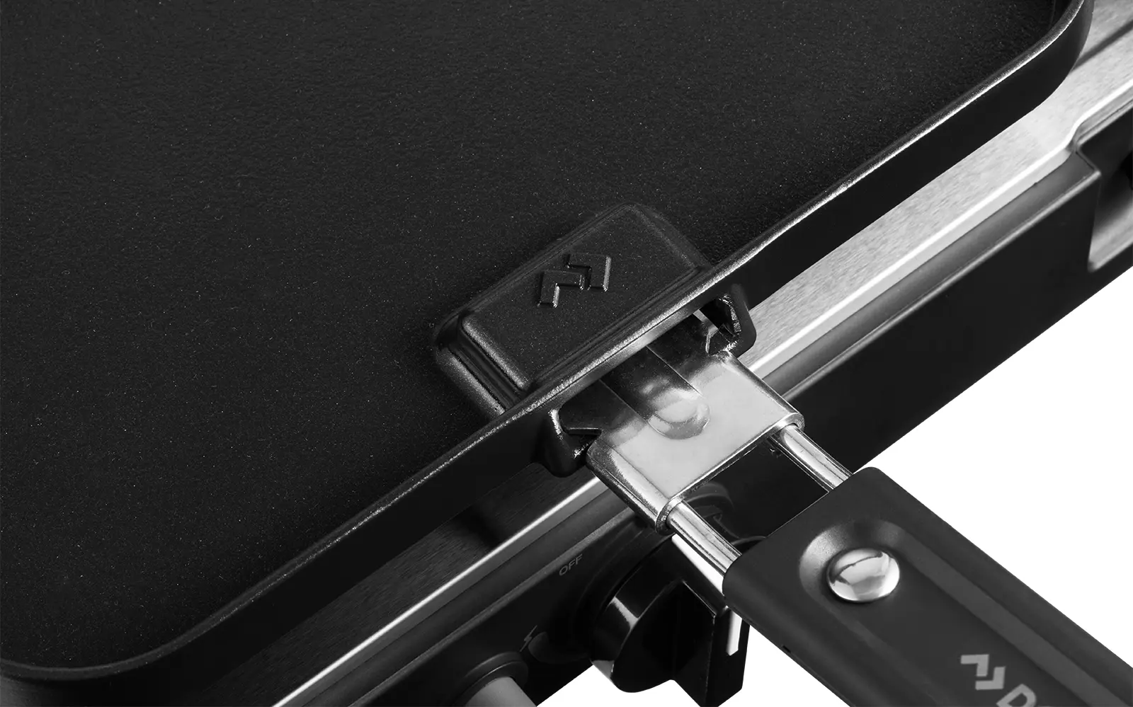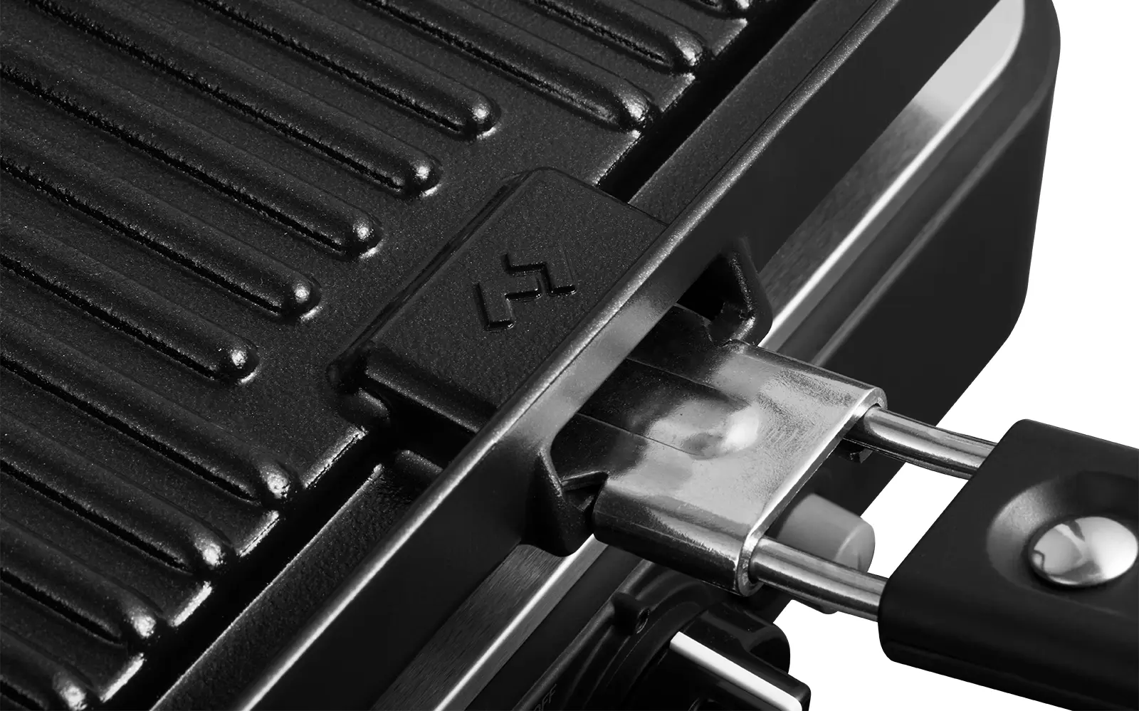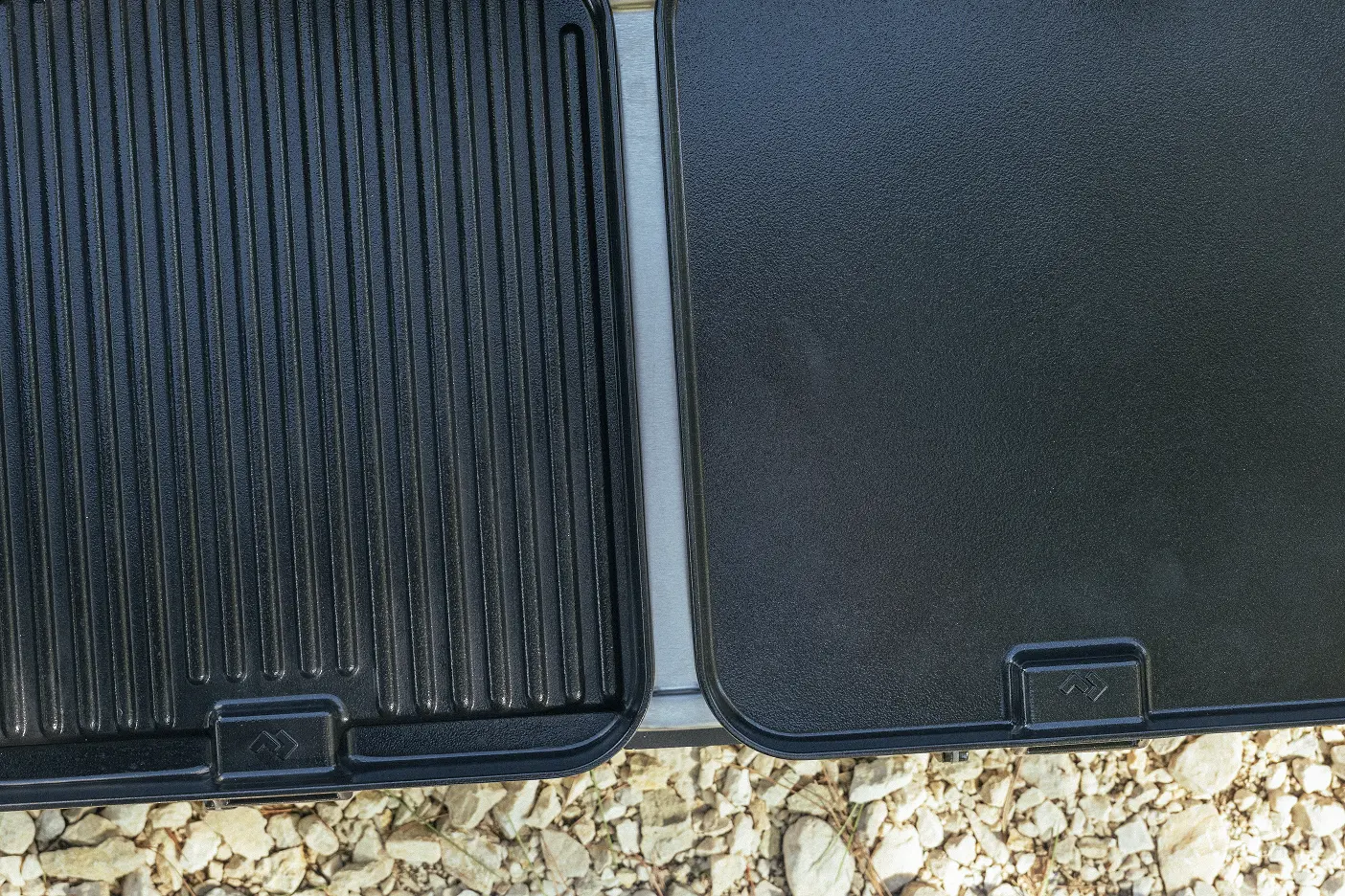 The flat ceramic plate works like a griddle for eggs, bacon, pancakes and delicate foods. The ribbed plate creates proper grill marks and allows fat to drain away, making it better for burgers, sausages, fish and vegetables. Both plates distribute heat evenly and clean easily with hot soapy water.