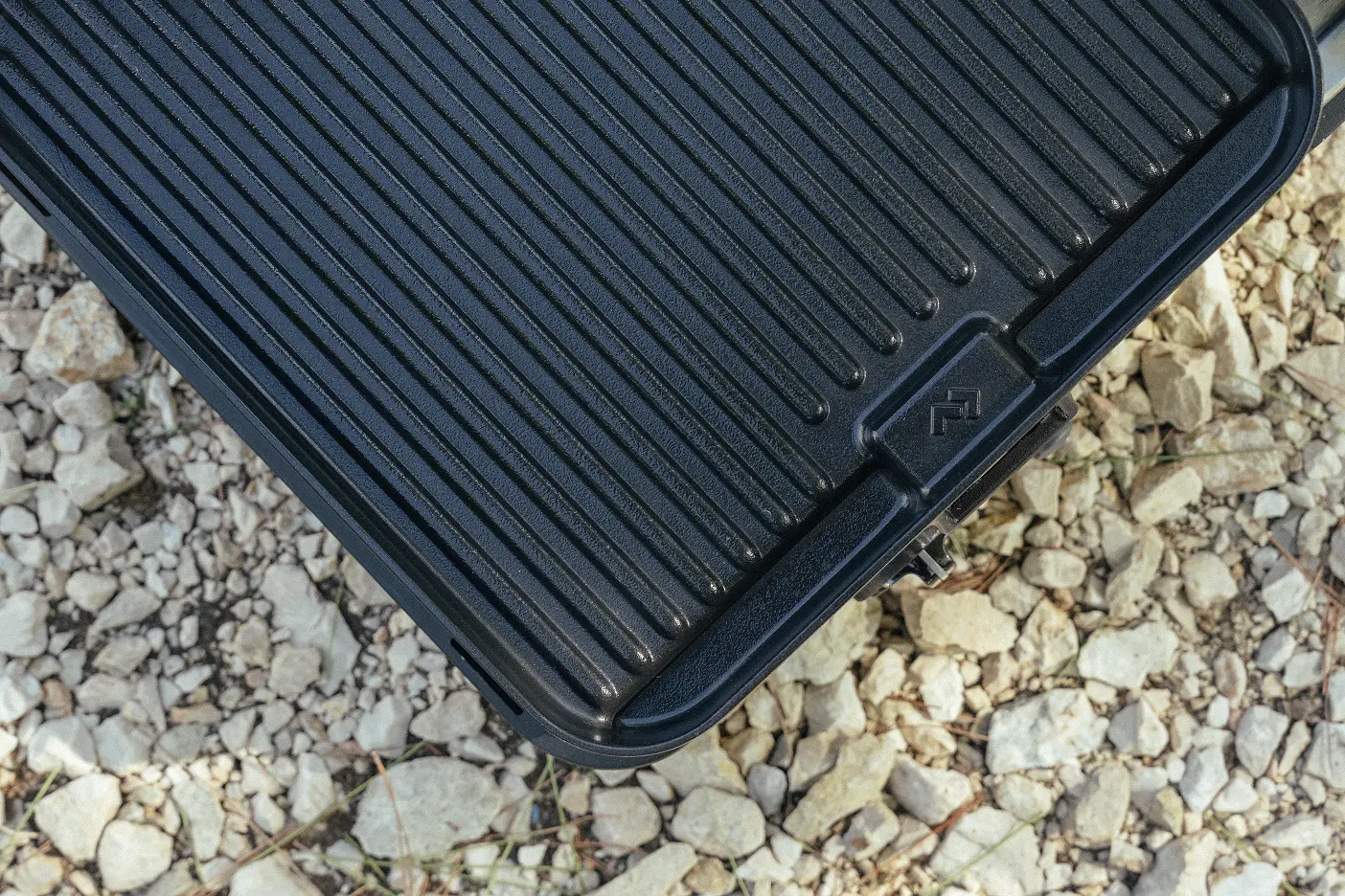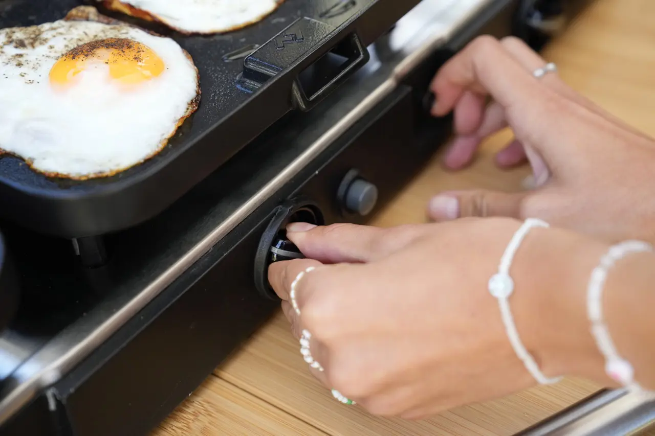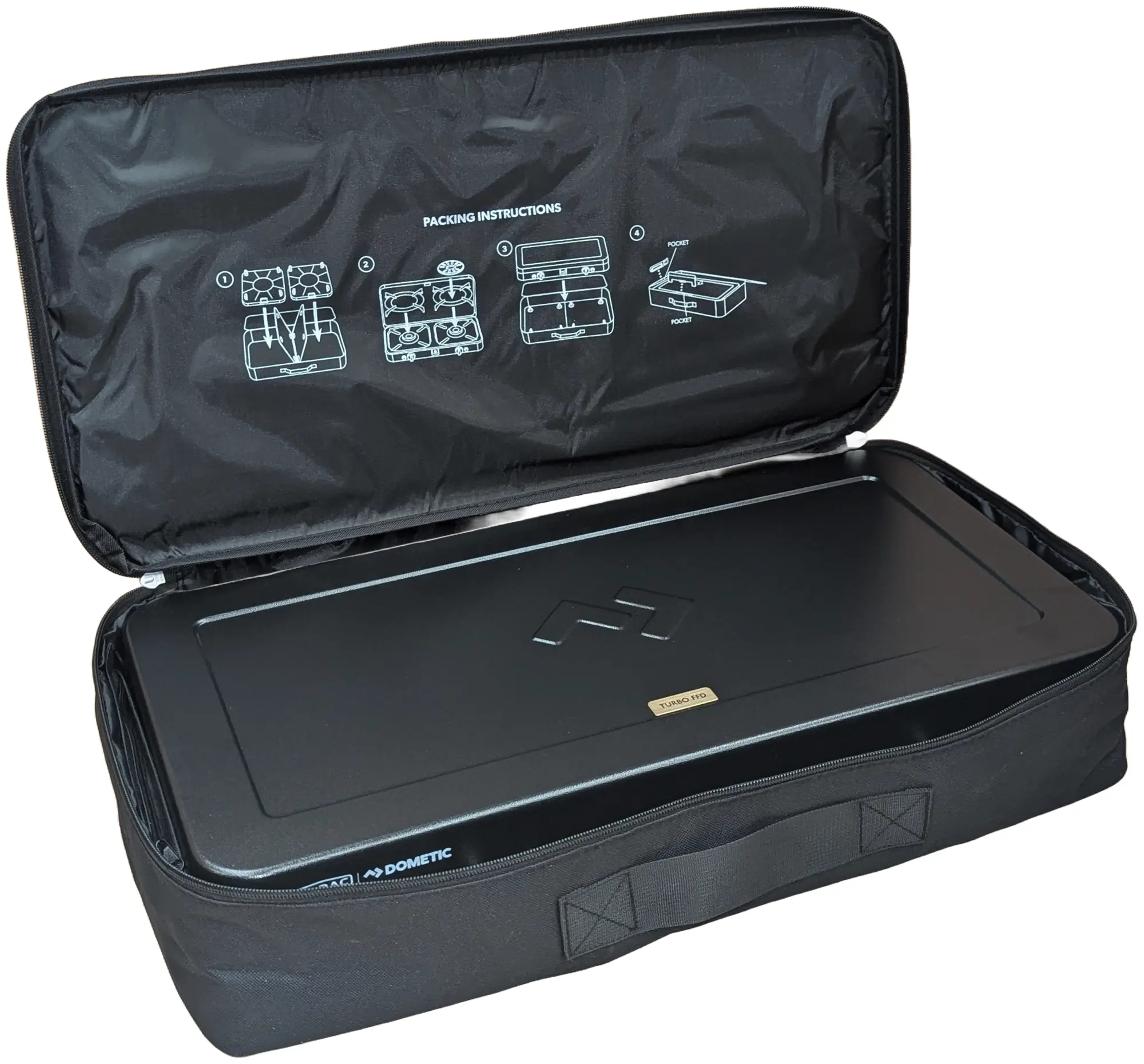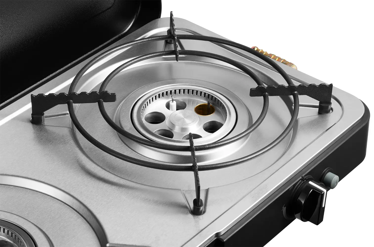 Compact storage makes this stove practical for caravanners and motorhomers. The cooking plates nest inside the base heat shield, control knobs recess flat, and everything packs into the included storage bag. At 5.8kg and measuring 57cm x 31cm when set up, it's substantial enough for proper cooking but won't dominate your storage space. The main consideration is that you'll need to buy the gas regulator separately, as different gas bottle types require specific regulators for safe connection.