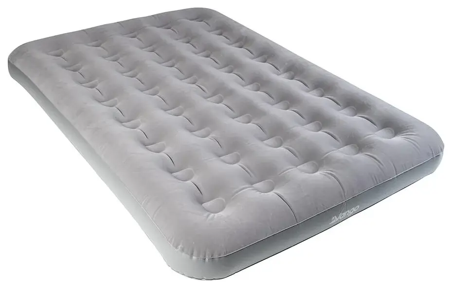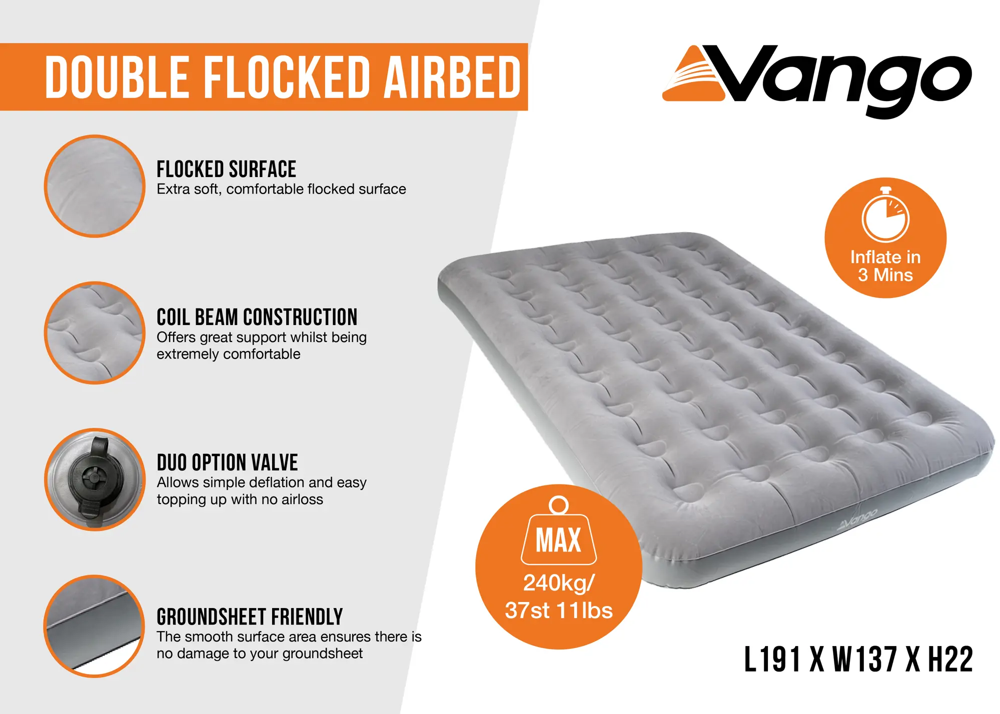 The Vango Double Flocked Airbed works with any standard camping pump. Manual foot pumps are the most common choice for camping trips as they don't need batteries or electricity. Battery-powered and electric pumps work faster, typically inflating the bed in under three minutes. Check your pump has the correct valve adapter - most camping pumps come with multiple nozzle sizes that fit standard airbed valves.