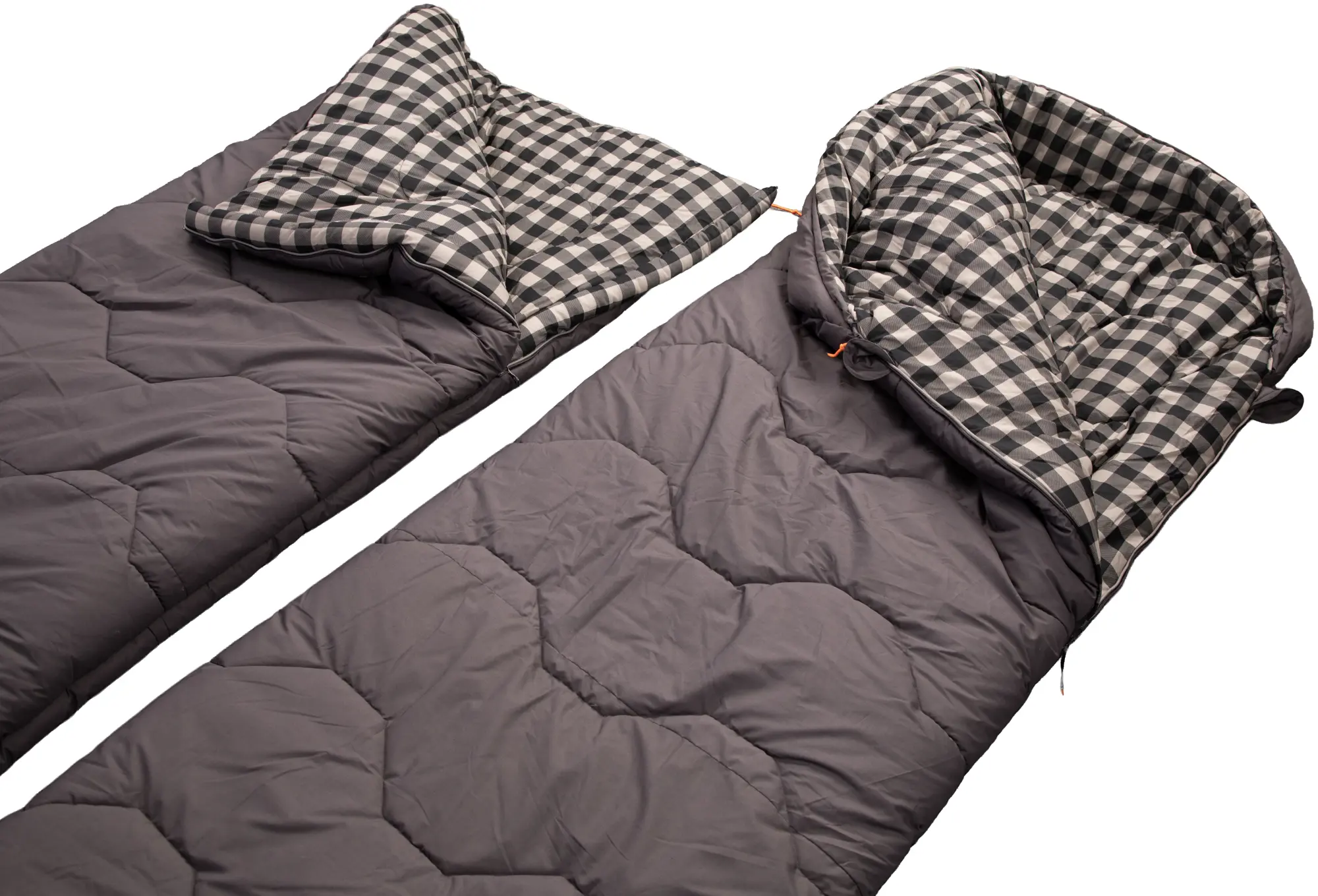 The bag uses a full-length zip that runs down the centre, allowing it to separate completely into two individual sleeping bags. Simply unzip the central connection and you have two singles, each with their own zip. This works well when temperatures warm up, when sleeping arrangements change, or when one person prefers different ventilation levels. The auto-lock two-way zips on each section prevent them from opening accidentally during the night.