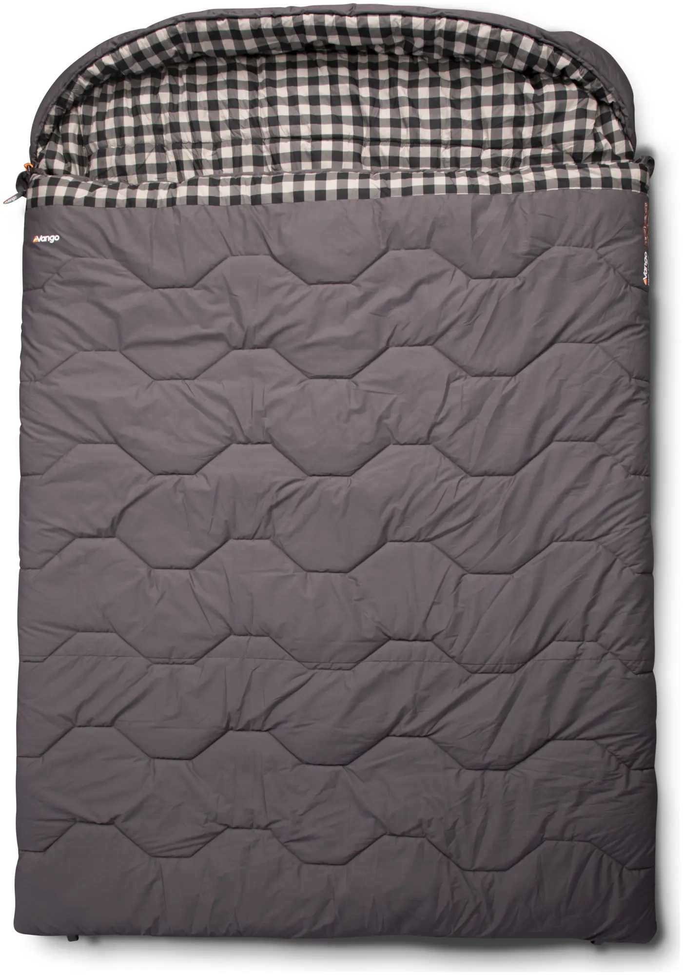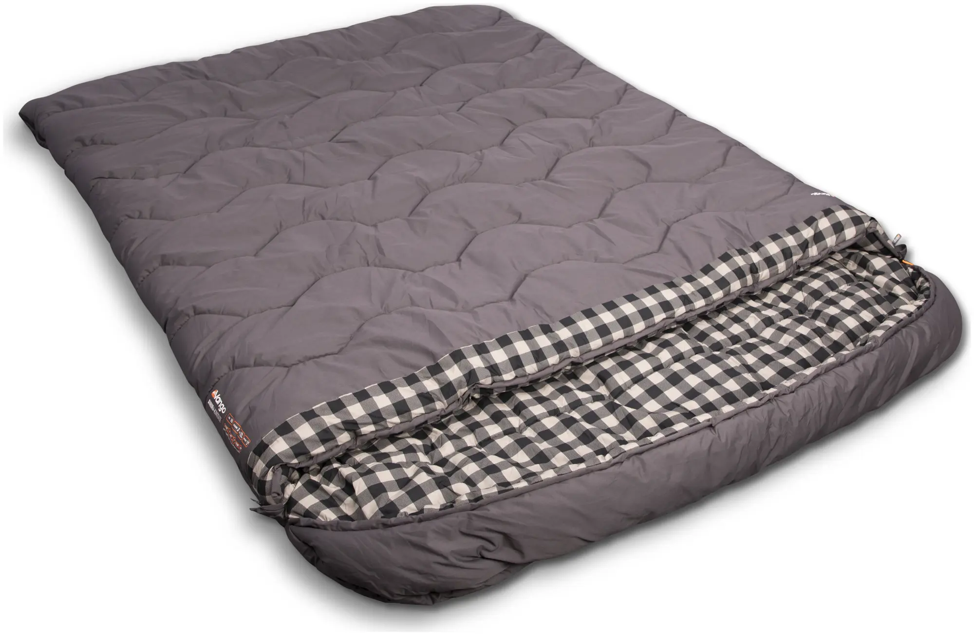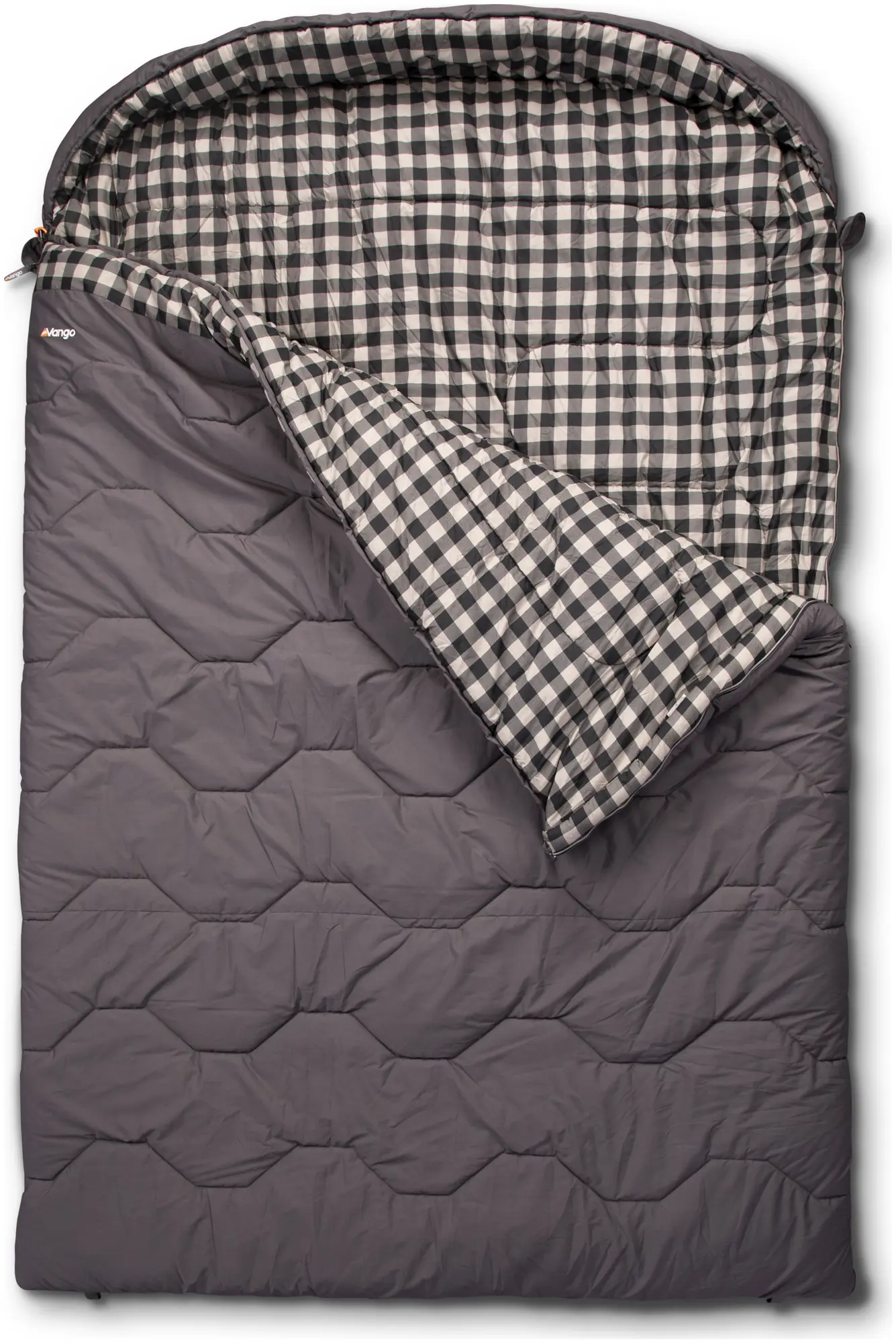 The Vango Aurora Kingsize Sleeping Bag stands out as a proper double sleeping bag that's actually big enough for two adults. We're talking wider and longer than standard doubles, which makes a real difference when you're not fighting for space at 2am. It's built as a 3-season bag, meaning you'll stay comfortable from spring through to autumn in typical UK camping conditions. The offset double layer construction stops cold air sneaking through the seams, whilst the insulated zip baffle does the same job along the zipper. You get an integrated headrest built in, which adds extra warmth around your head and shoulders where you need it most.