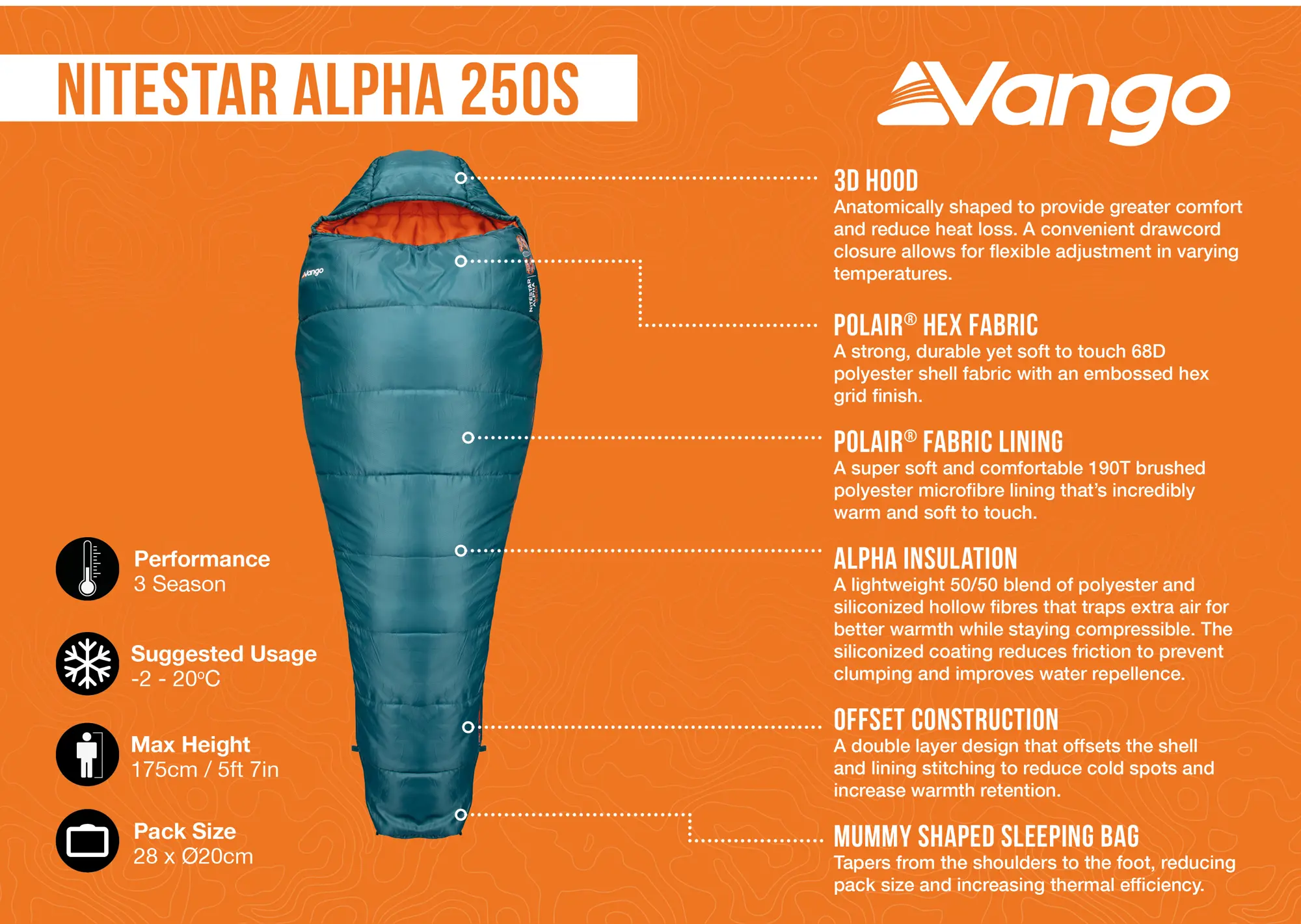 The 250S designation typically indicates this is a standard adult size sleeping bag suitable for people up to approximately 183cm tall. Vango uses mummy shaping that tapers from shoulders to feet, so the bag fits closer to your body than rectangular sleeping bags. If you're particularly tall, broad-shouldered, or prefer more room to move, look at the dimensions carefully or consider a larger size in the Nitestar Alpha range if available.