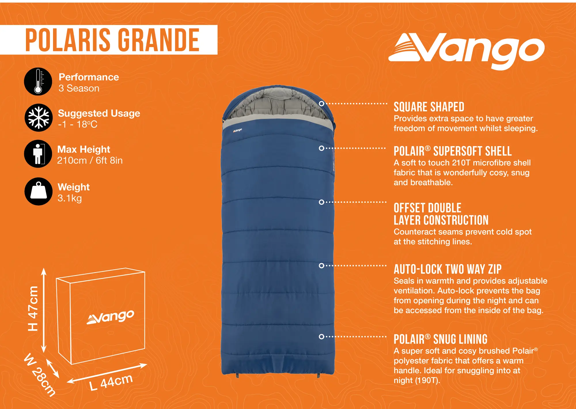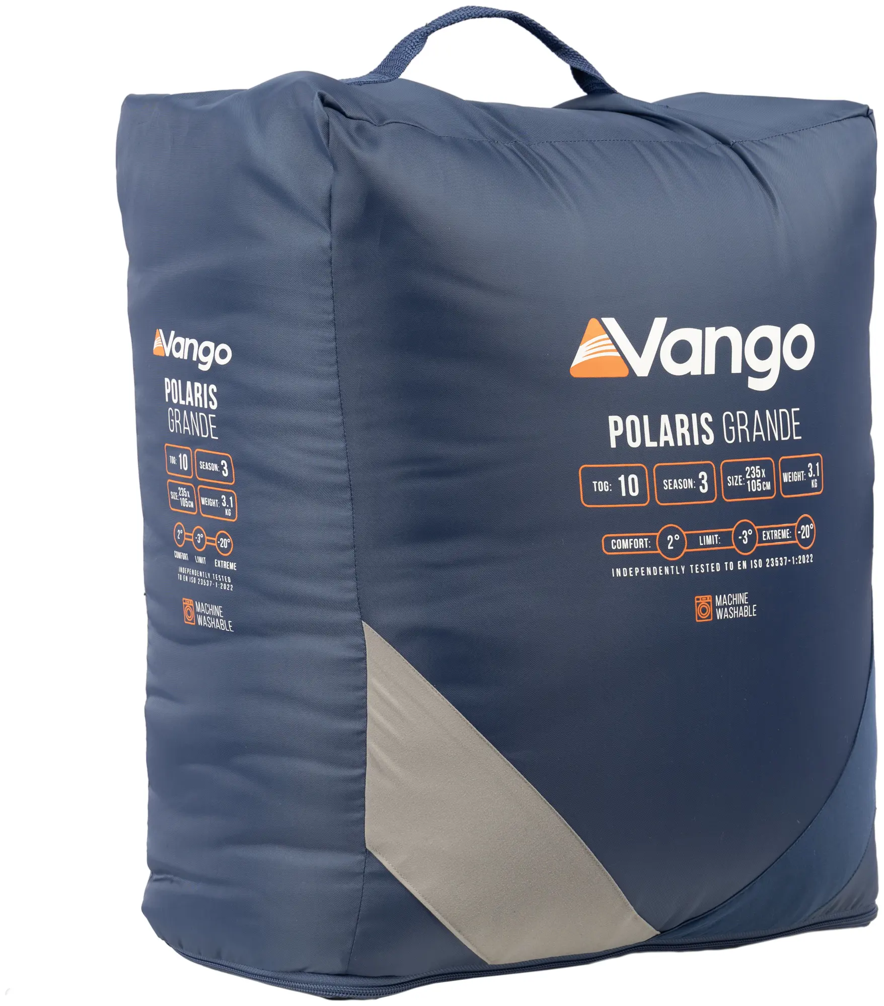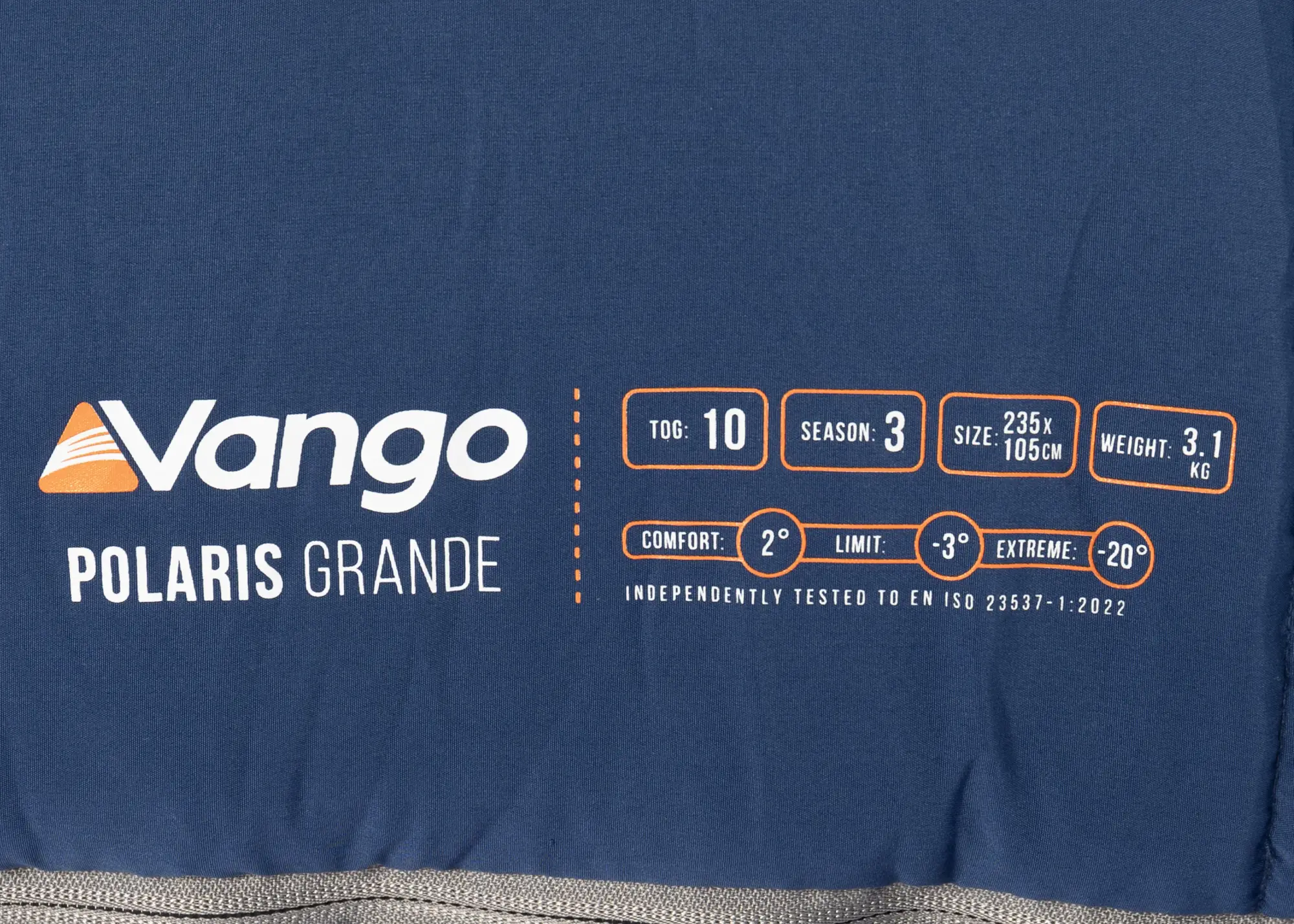 The Polaris Grande has been independently tested to EN ISO 23537-1:2022 standards. This European standard provides comfort, lower limit, and extreme temperature ratings based on standardised testing methods. Check the specific rating label on your bag, as Vango produces different warmth ratings within the Polaris range to suit different seasons and conditions.