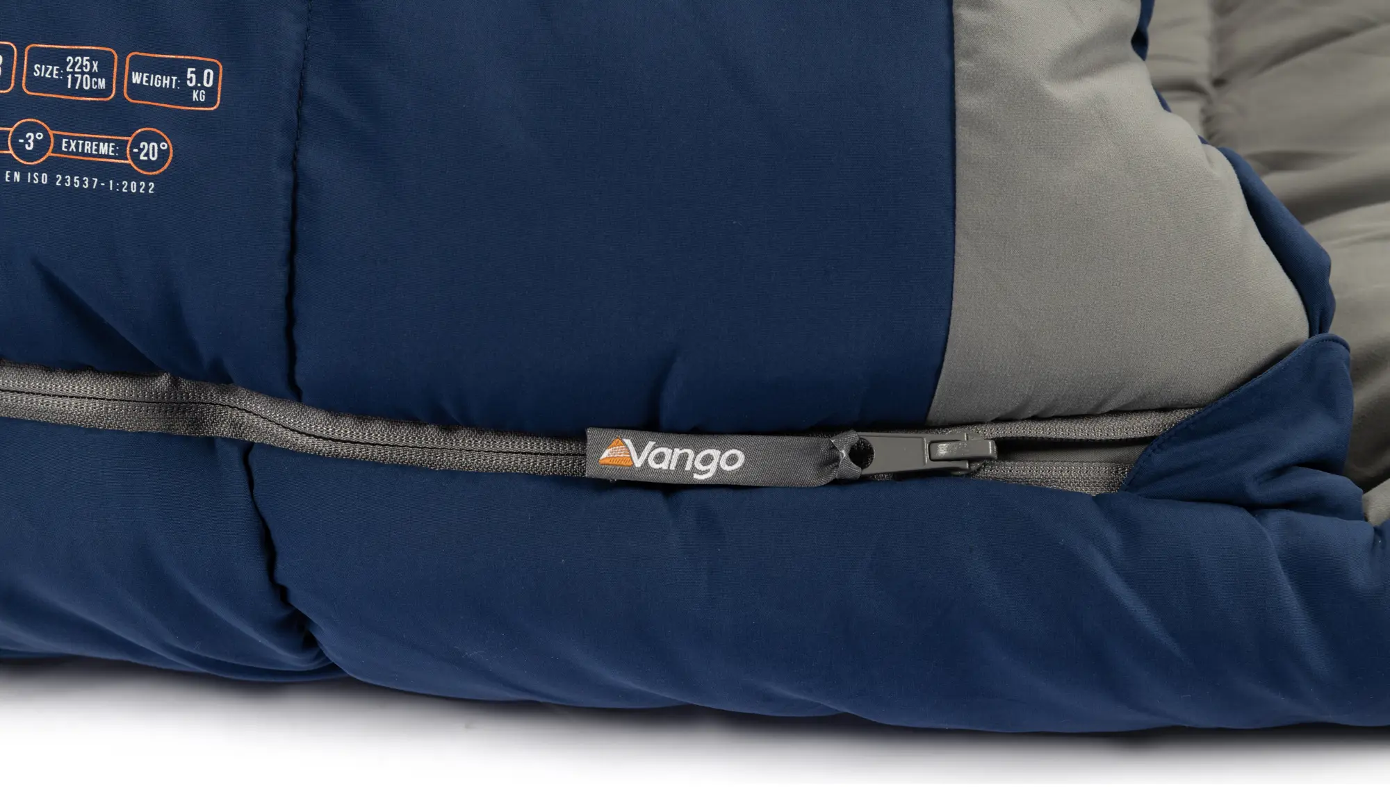 Vango hasn't published official weight specifications for this model, but kingsize double sleeping bags with synthetic insulation typically weigh between 3.5-4.5kg and pack down to approximately 40-45cm length by 30-35cm diameter in the square carry bag. This makes them suitable for car camping, campervan use, and caravan pitches where weight and pack size aren't critical factors. The square-shaped carry bag takes up more boot space than compression stuff sacks but makes packing easier and puts less stress on the insulation fibres during storage.