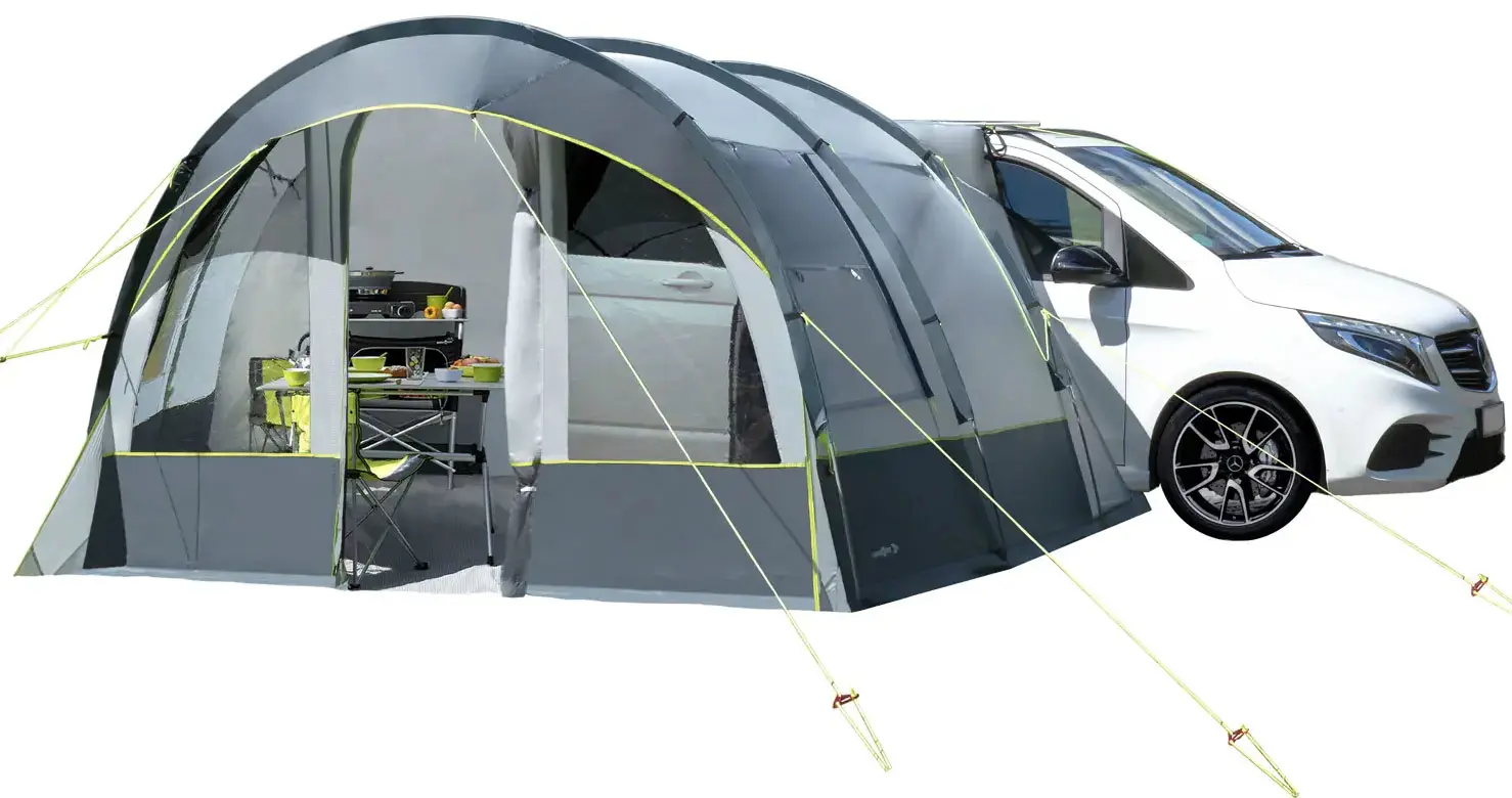 Easily attach using the awning pipe (kador strip in C-channel rail), channel pole (tunnel pole in gutter), or straps to roof rails. An optional channel adapter set adds even more flexibility. The rear connection wall closes fully, letting you drive away without collapsing your comfy awning space.