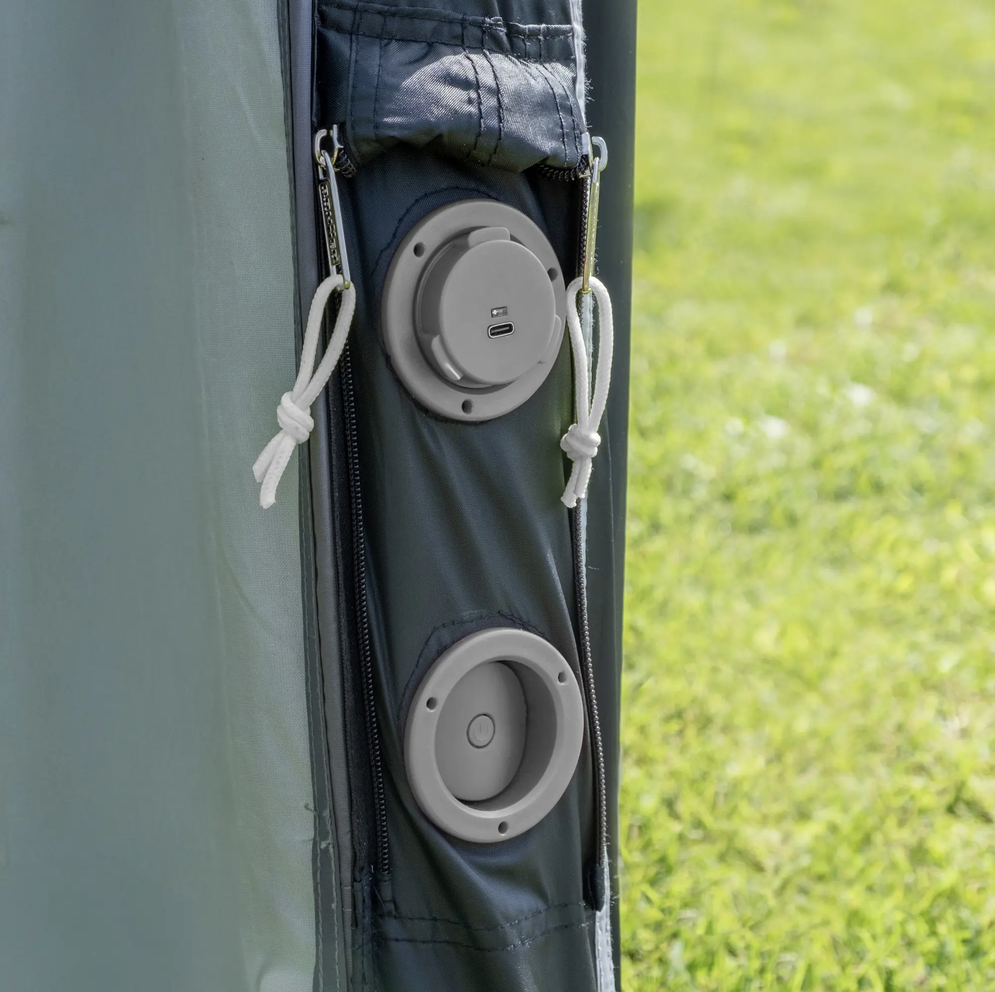 Simply attach the integrated electric pump hose to the main valves. Switch it on with the rechargeable battery; it auto-inflates all tubes including crossbeams to a great 225 cm height. It includes a pressure relief valve. Deflate by opening the valves for quick pack-down. The pump stores neatly in the bag.
