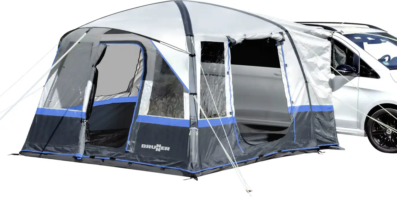 The Brunner Trouper Auto-Up Driveaway Campervan Awning sets up in minutes using its integrated electric pump and air tubes. Campervan owners attach it to their vehicle with piping or Velcro, then inflate it for a spacious, sheltered area.