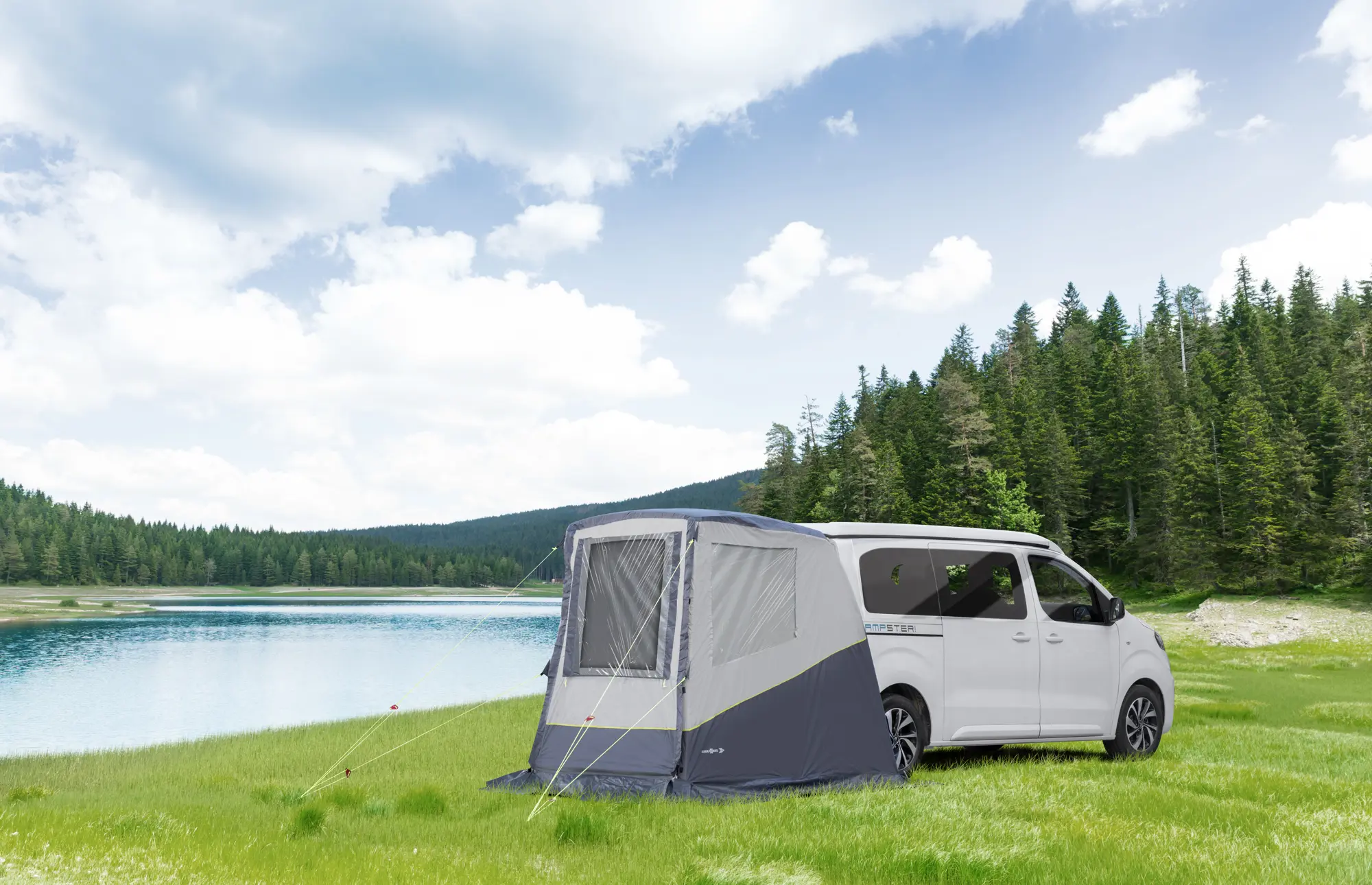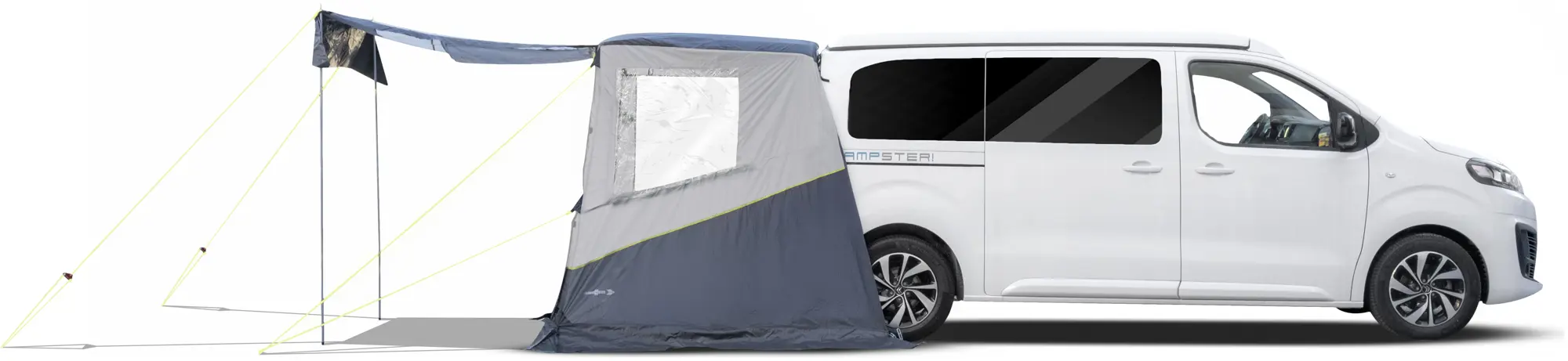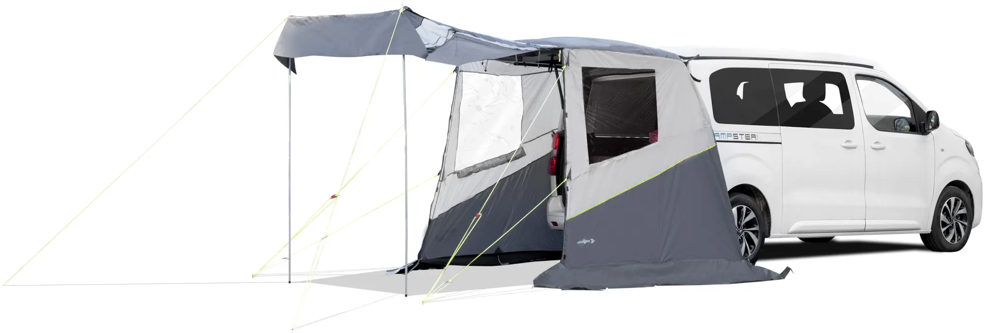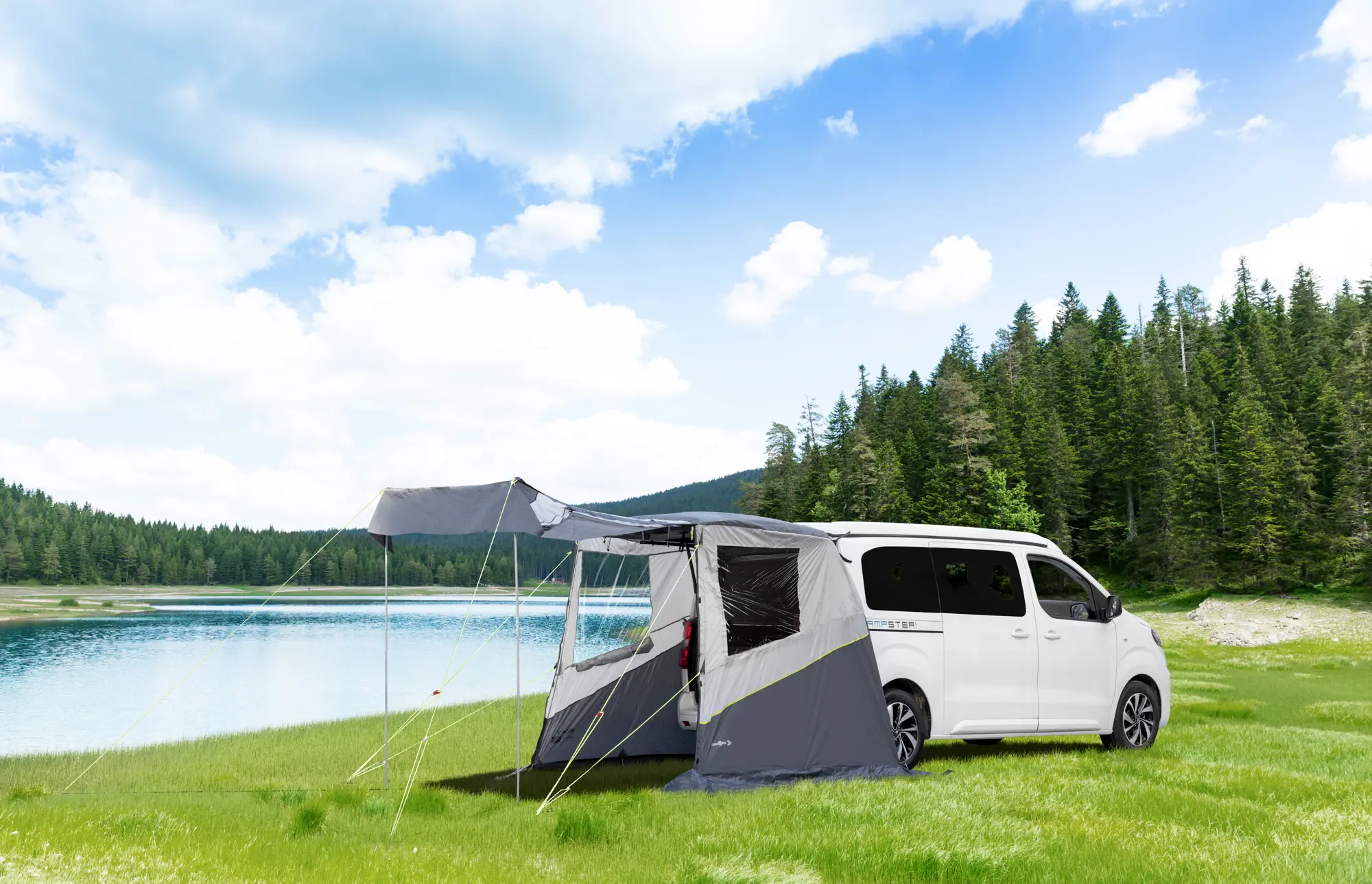 The Brunner Escape fits Peugeot Traveller, Citroën Spacetourer and Toyota Proace models that share identical construction with rear tailgate doors. The tent is designed for vehicles with a tailgate height of 195cm. Before purchasing, compare the tent dimensions of 160cm wide x 210cm deep x 195cm high against your specific vehicle model to confirm compatibility. The tent roof places over the open tailgate whilst side walls attach to the vehicle body.