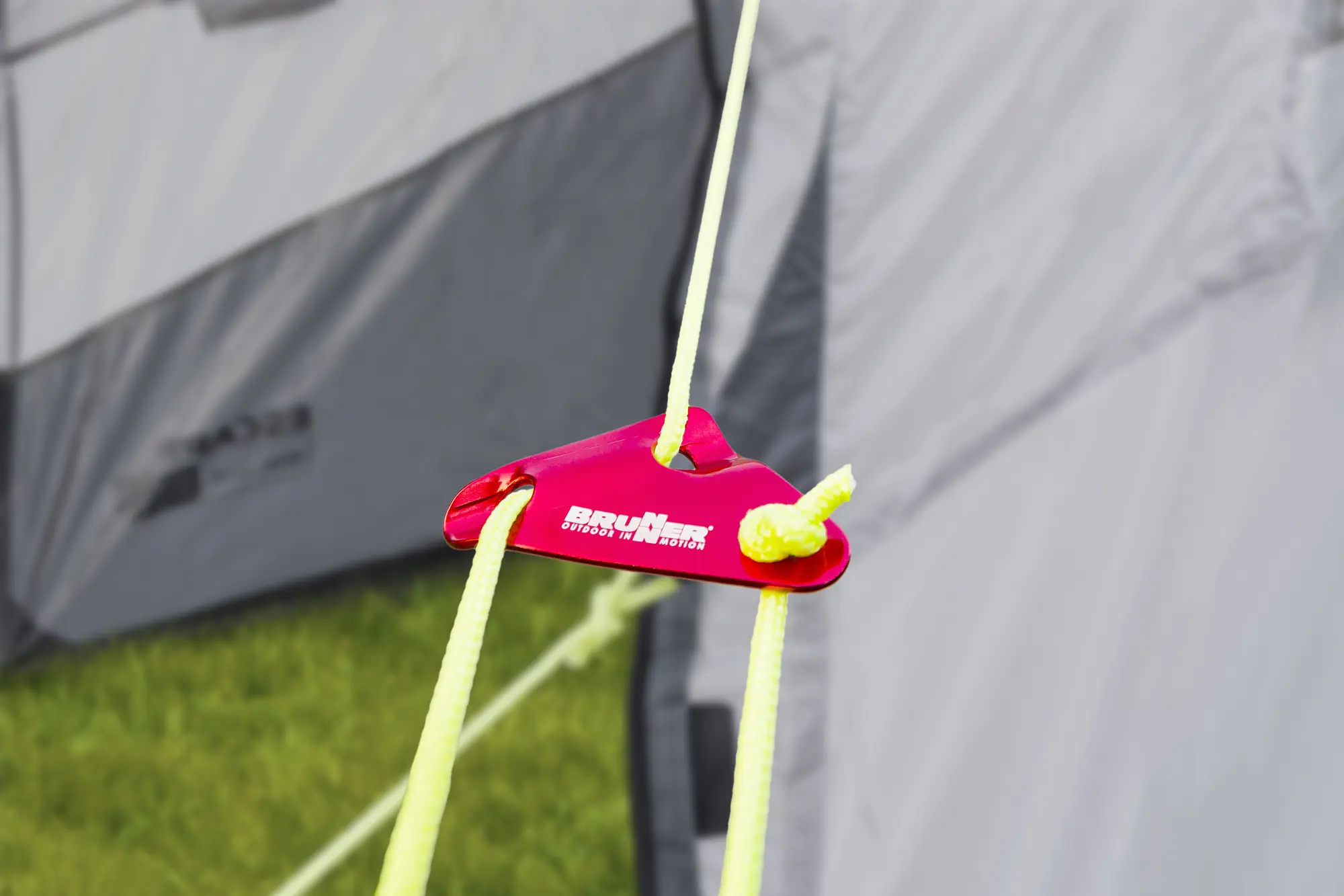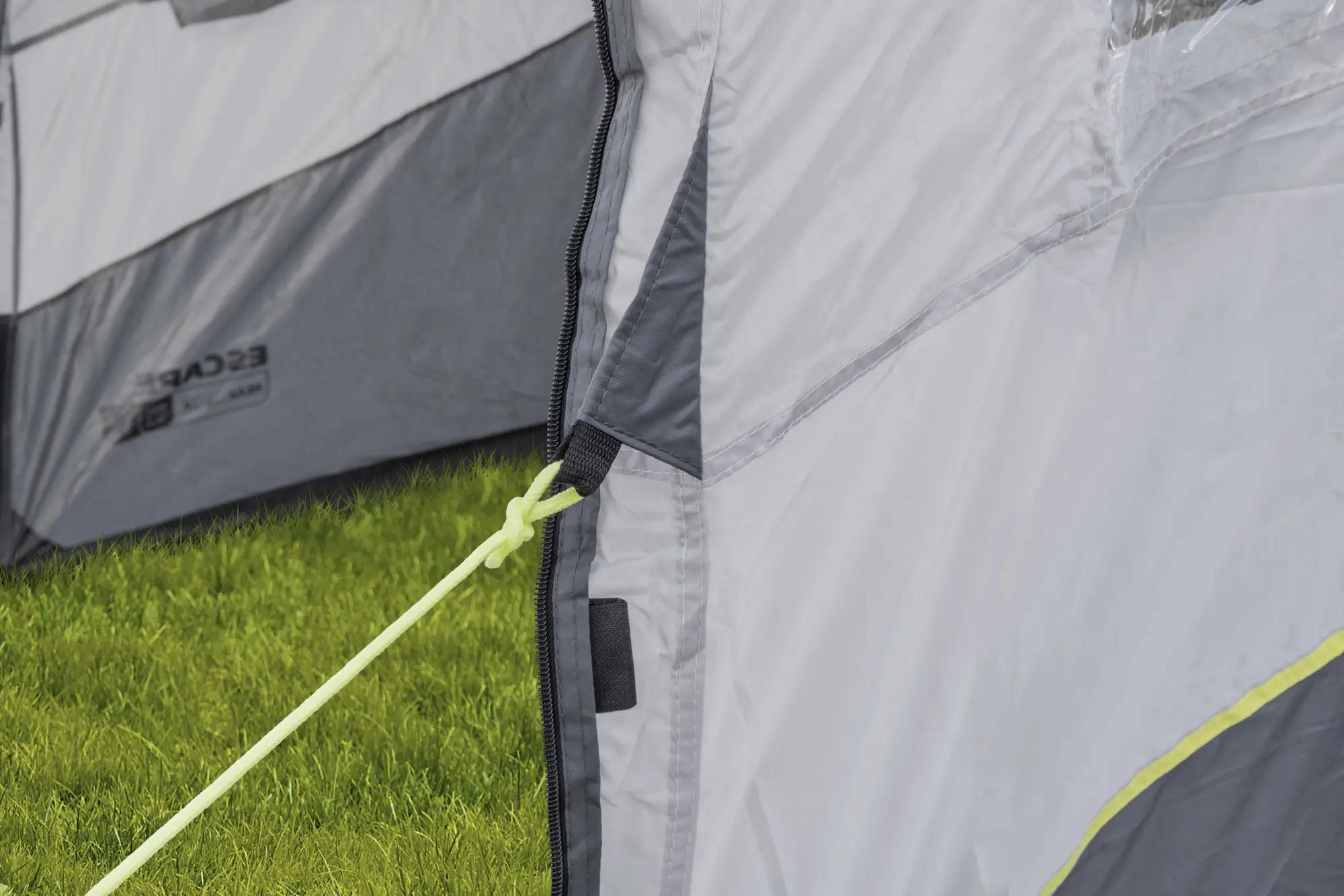 The Brunner Escape achieves wind stability through multiple tensioning points rather than traditional poles. Sturdy straps fix the tent roof to your tailgate, while the side walls attach directly to your vehicle. At ground level, numerous guy ropes with exchangeable rubber bands create tension across multiple anchor points. This distribution of force makes the tent resistant to wind without the weight or complexity of a frame structure. The external mud flaps with eyelets add further stability whilst keeping rainwater away from the tent base.